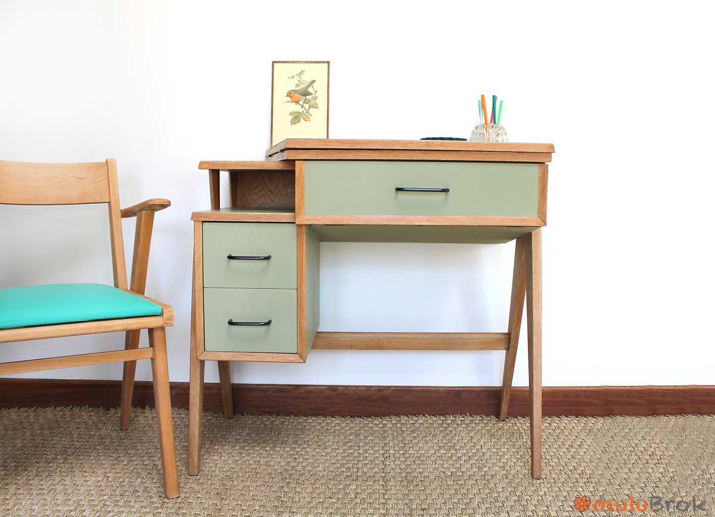 Transformé et rénové en Bureau, coloris Vert de Gris et bois verni (produits Libéron).
