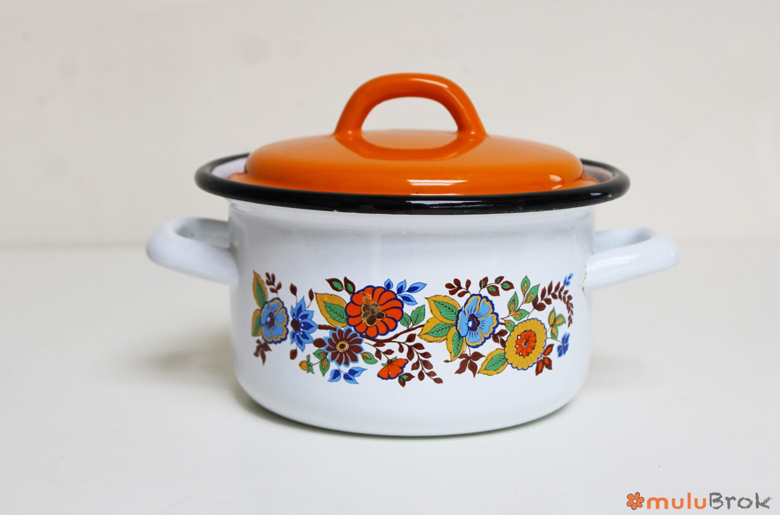 Elle est en bon état : léger saut d’émail sur le bord du couvercle.