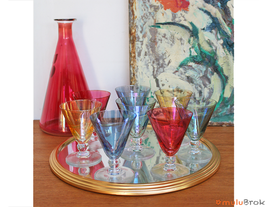 1 Carafe + 8 Verres à pied (2 verts / 2 bleus / 2 roses / 2 jaunes) .
