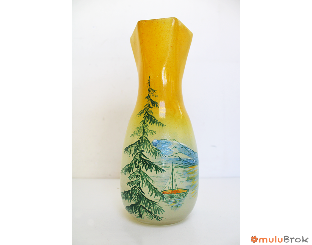 Ancien vase ovoïde soufflé à col hexagonal peint à la main.