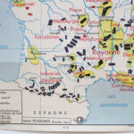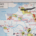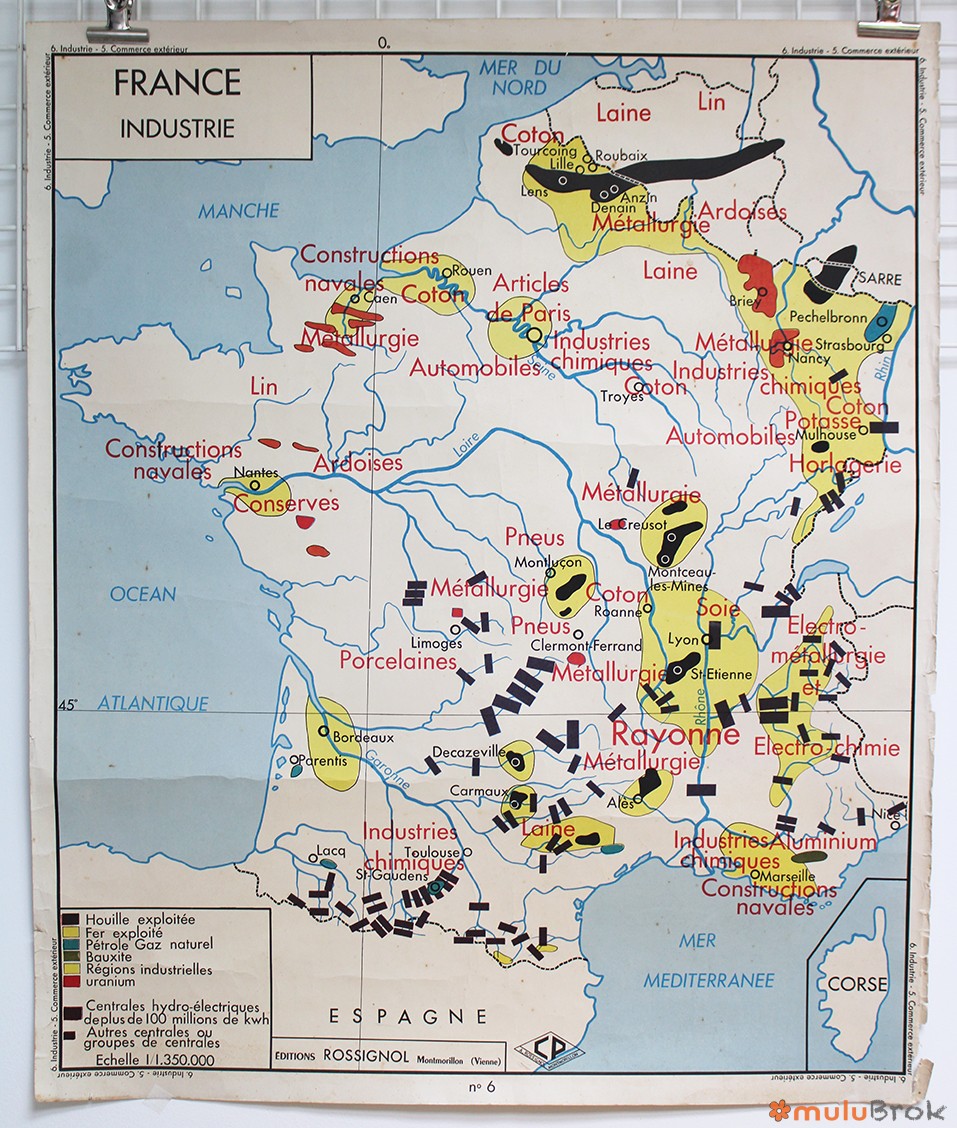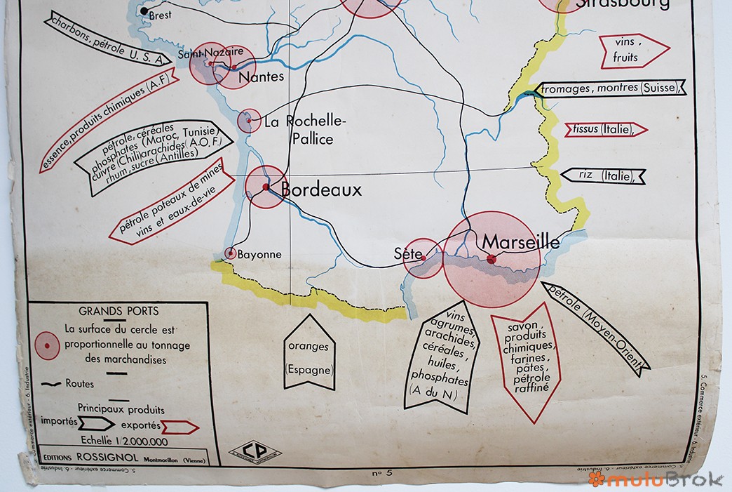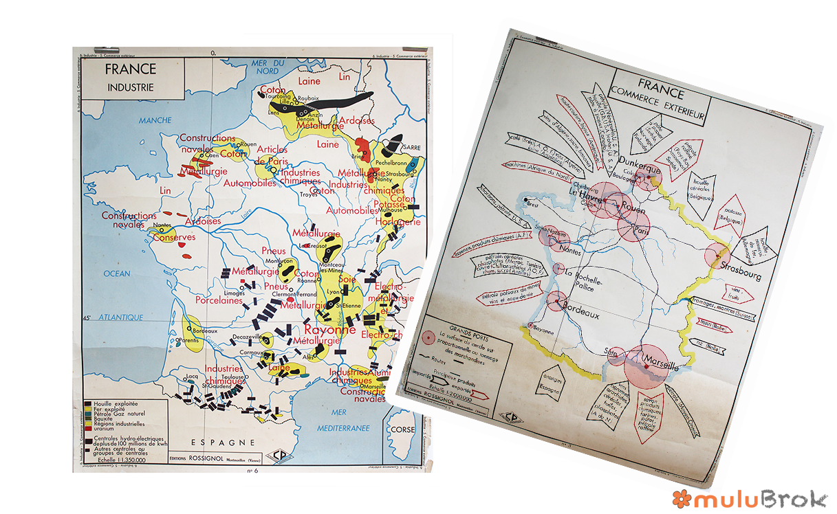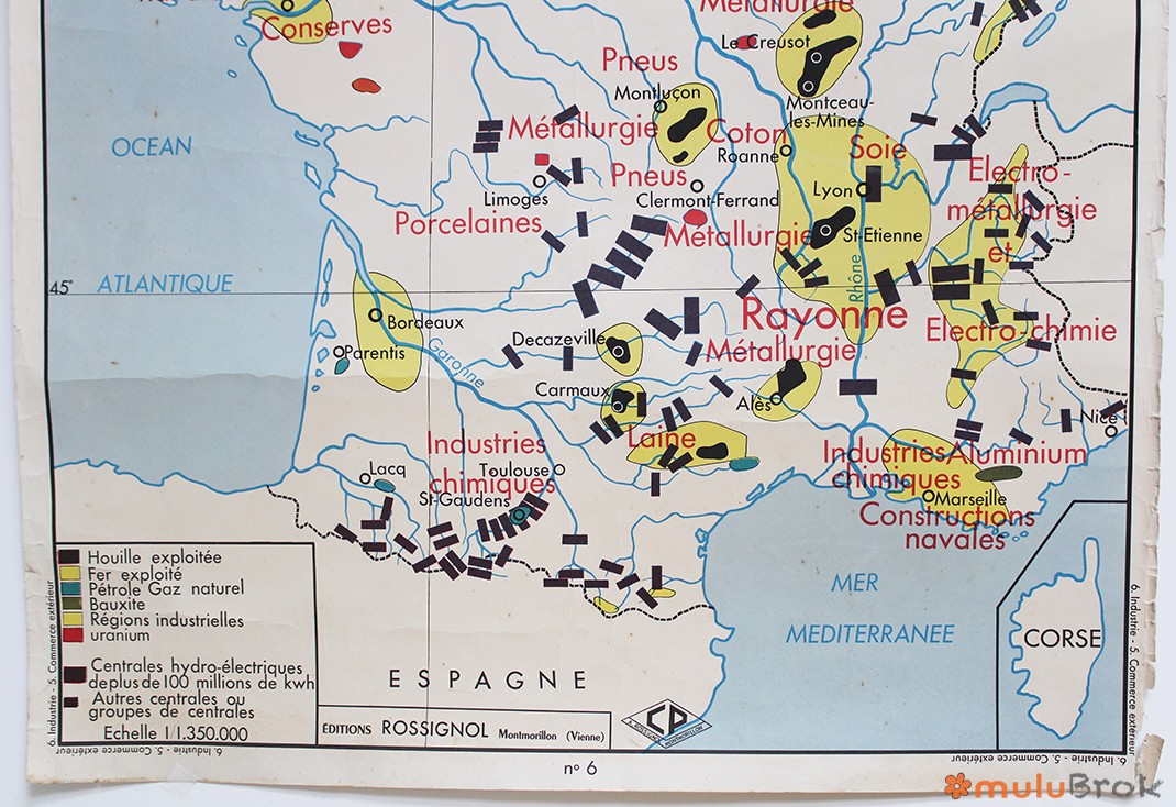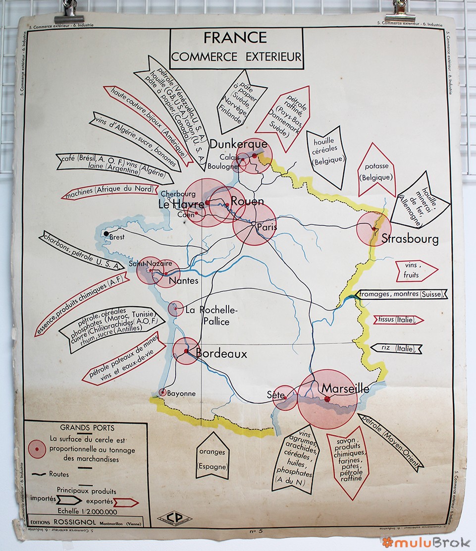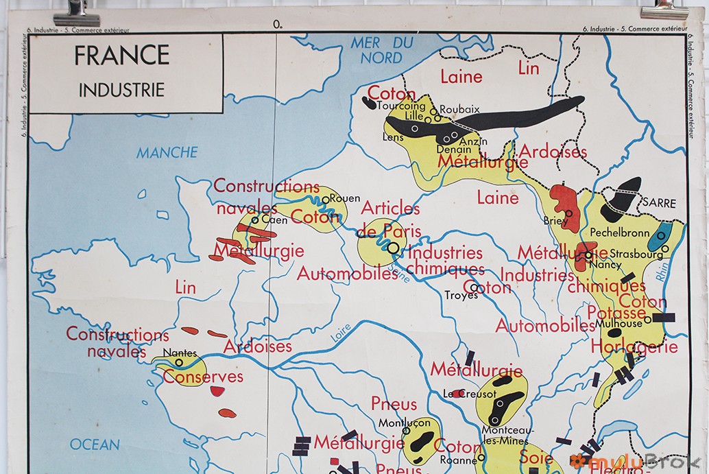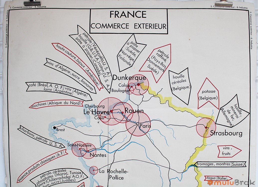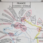 Ancienne affiche scolaire géographique de l’industrie et du Commerce Extérieur en France.