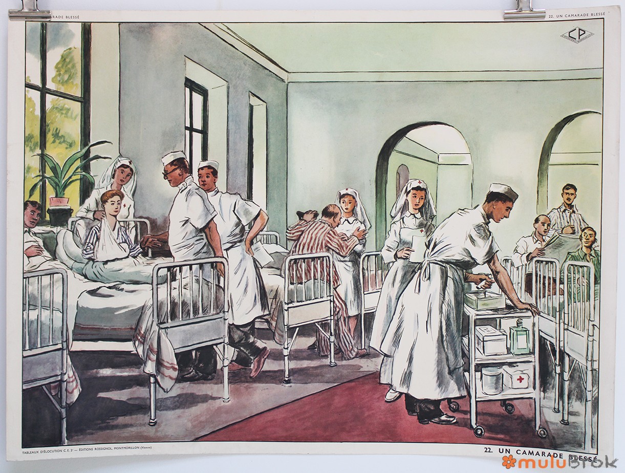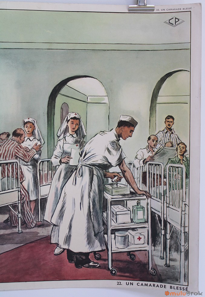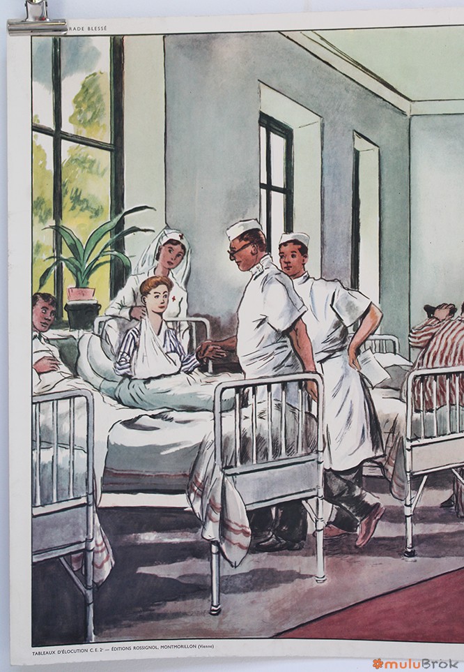 Verso : UN CAMARADE BLESSE (hopital, docteur, infirmières, malades…).