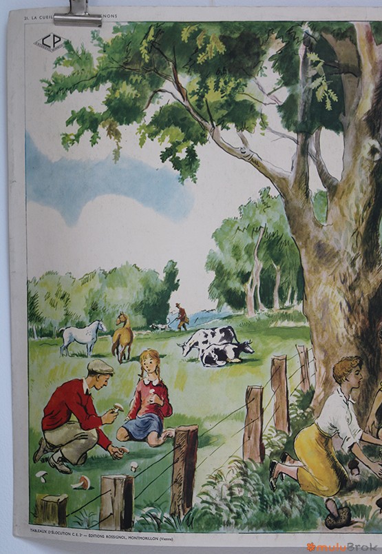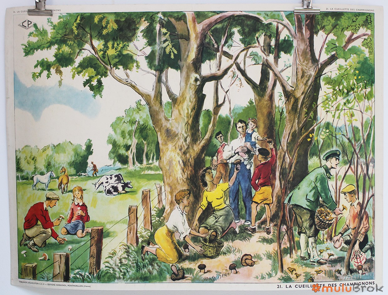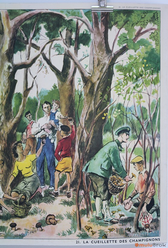 Ancienne affiche scolaire La cueillette des champignons Un camarade blessé
