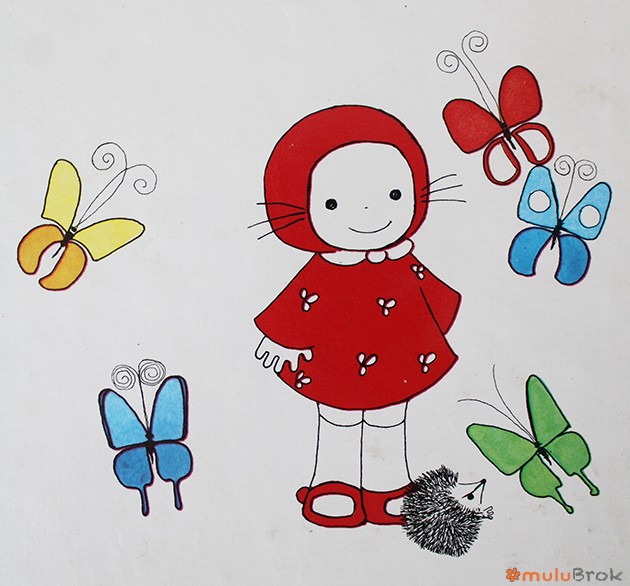 Elle a une robe rouge avec des fleurs blanches, et un bonnet rouge.
