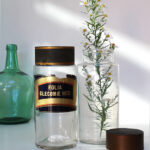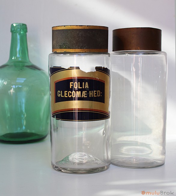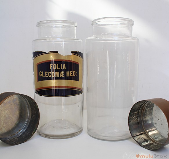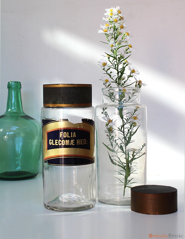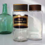 Pot avec étiquette dorée, collée à l’intérieur d’un flacon : FOLIA GLECOMAE HED:
