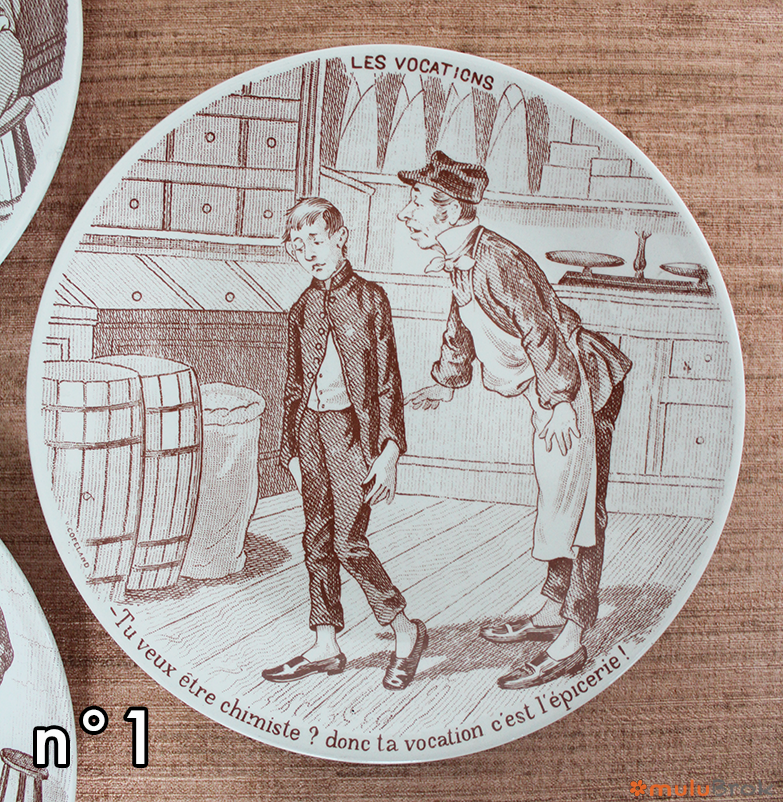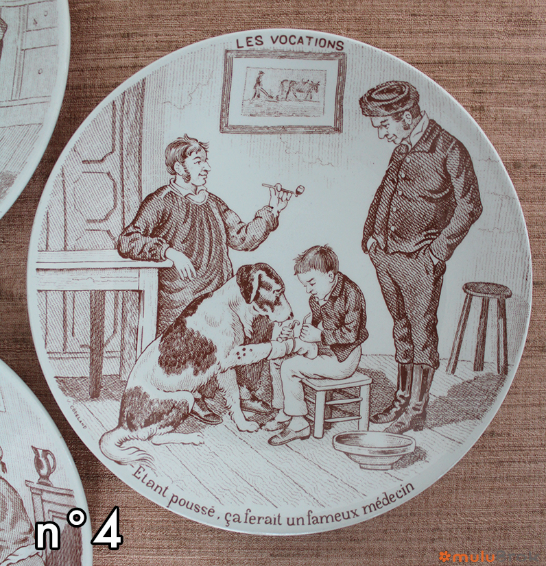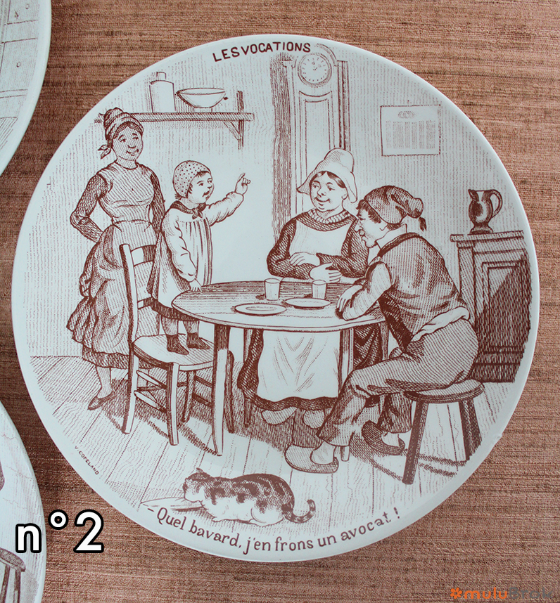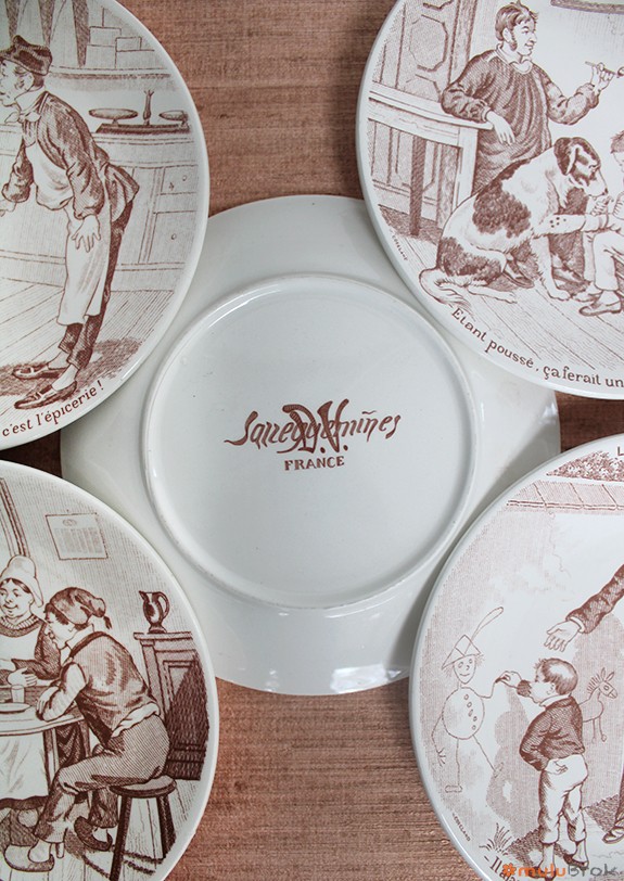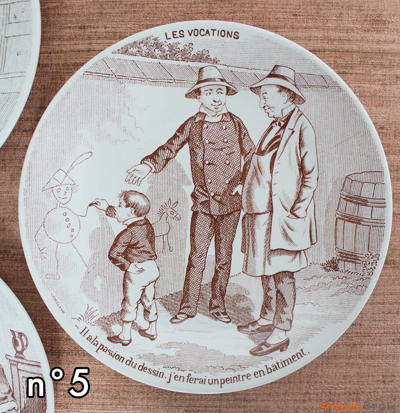 Anciennes assiettes parlantes aux dessins humoristiques.