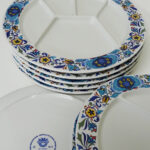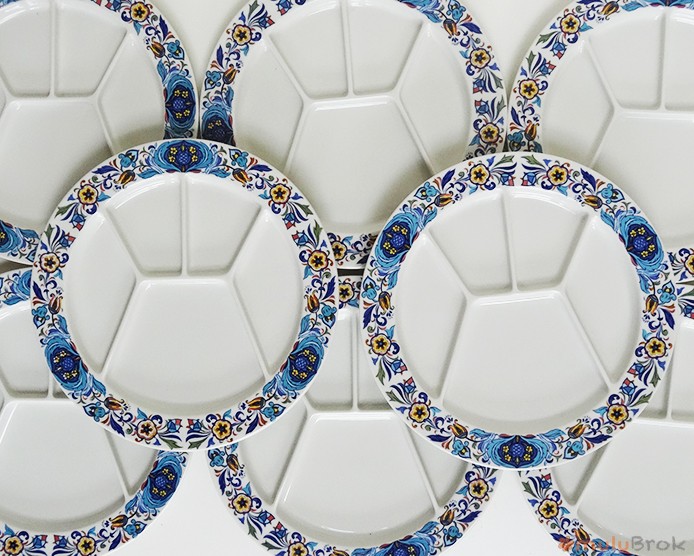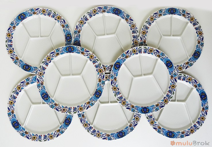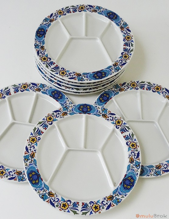 Assiette au joli motif bleu, à 5 compartiments pour la fondue.
