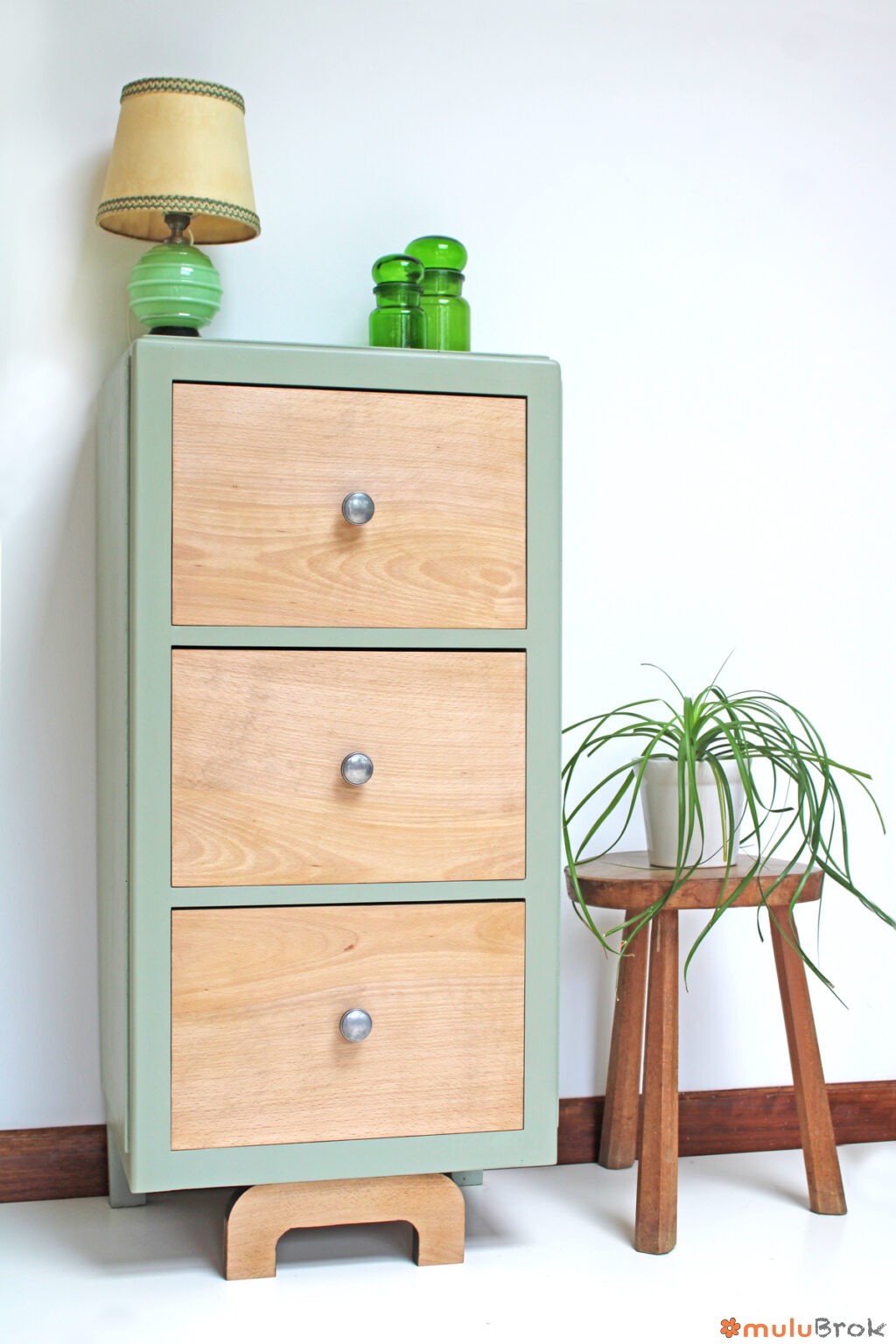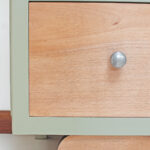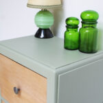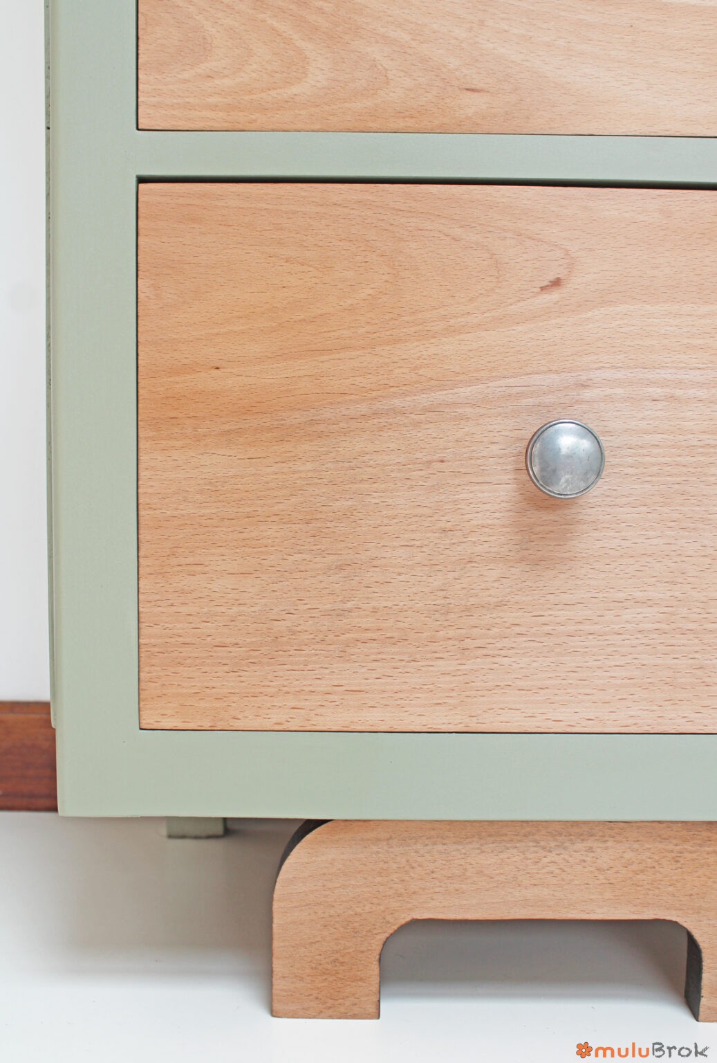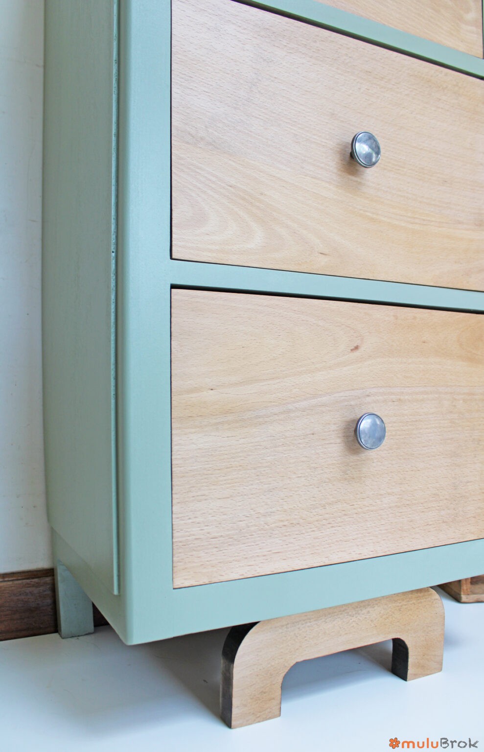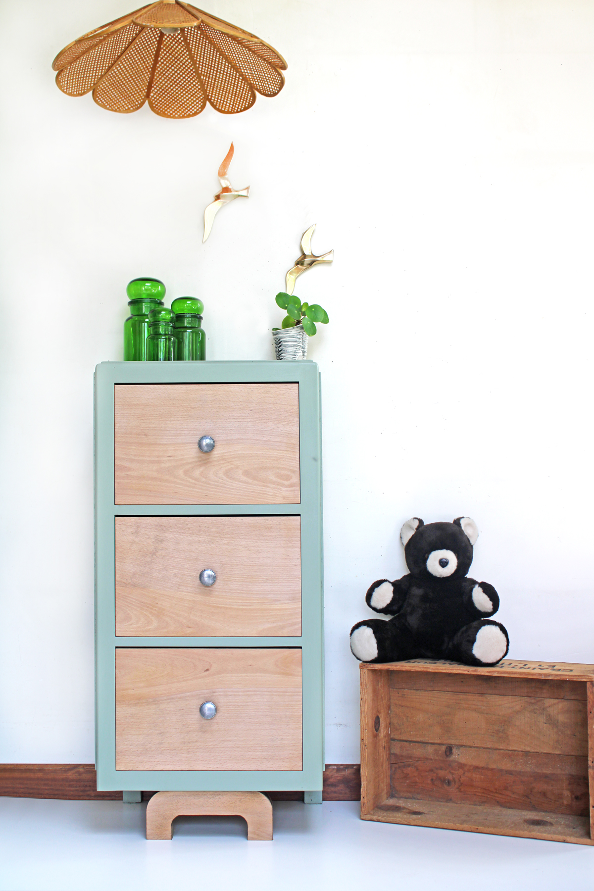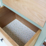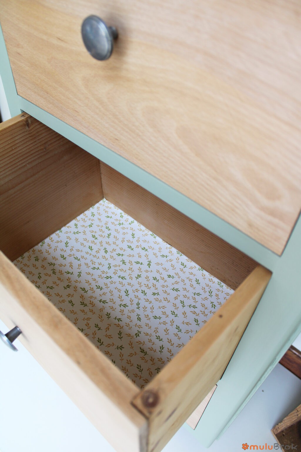 Le fond intérieur des tiroirs est décoré d’un papier peint vintage.