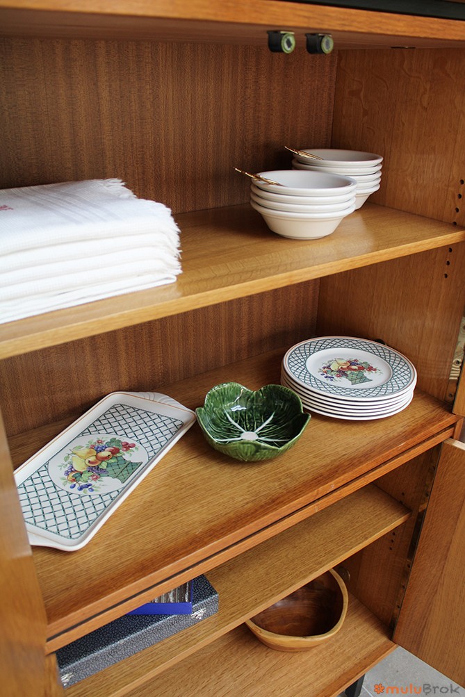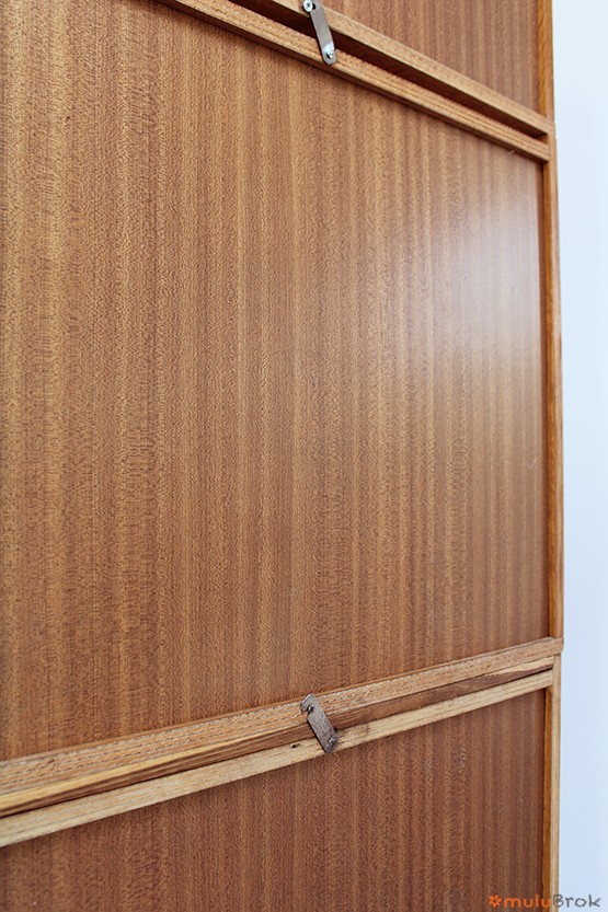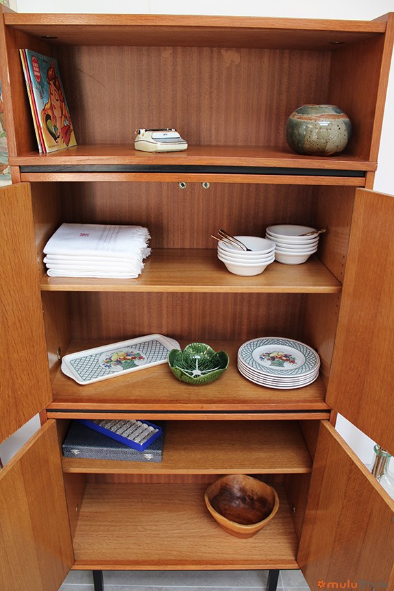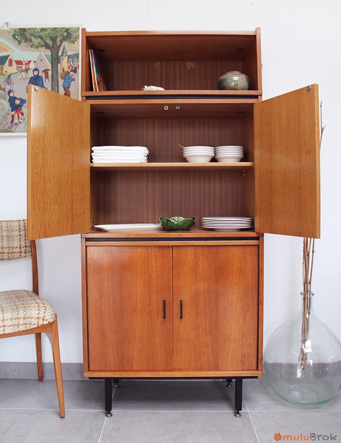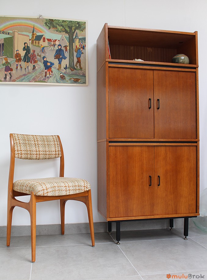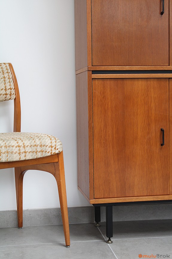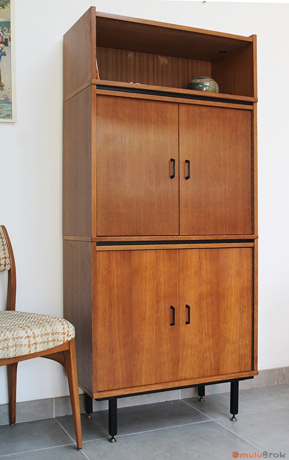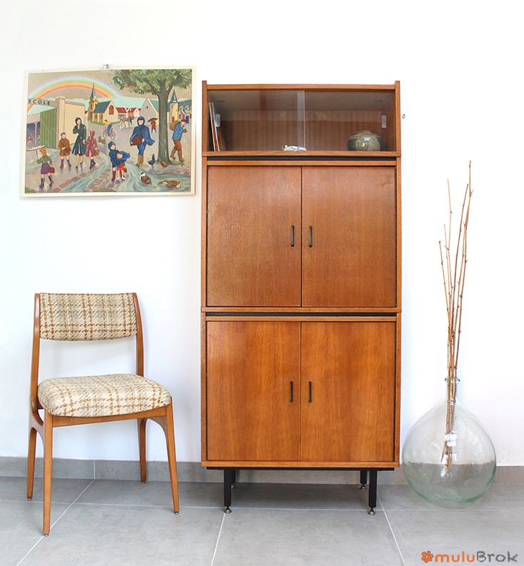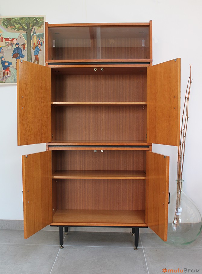 2 modules identiques : 2 portes, poignées métal, 1 étagère intérieure réglable en hauteur.