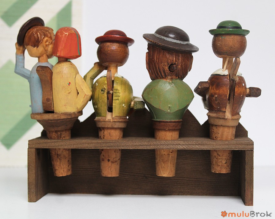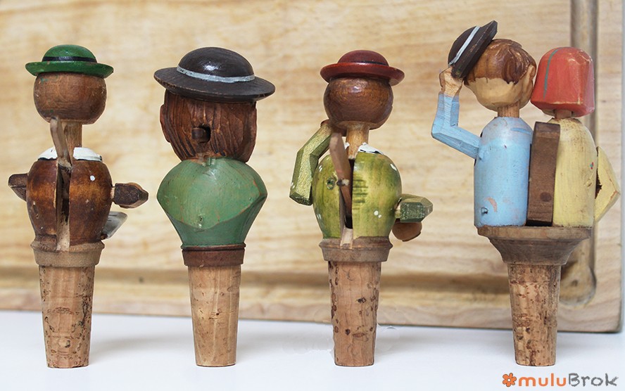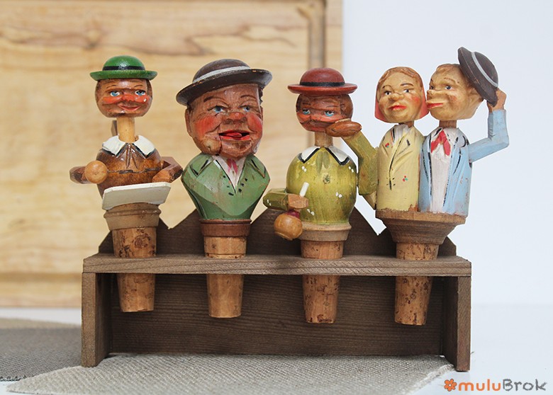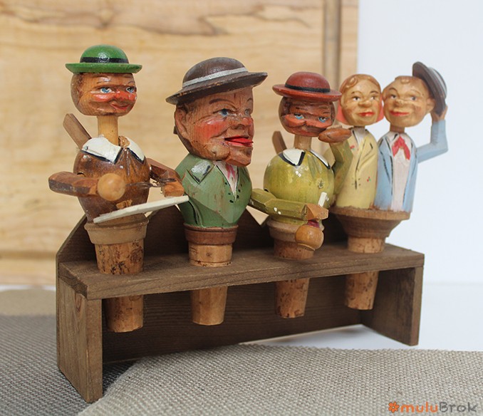 Anciens bouchons à système en bois sculpté, base en liège.