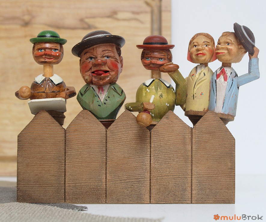 Têtes de personnages articulés par une tirette à l’arrière qui actionne un membre (tête, bras…).