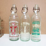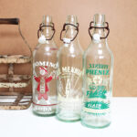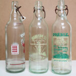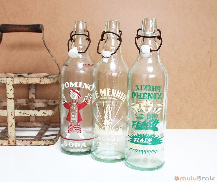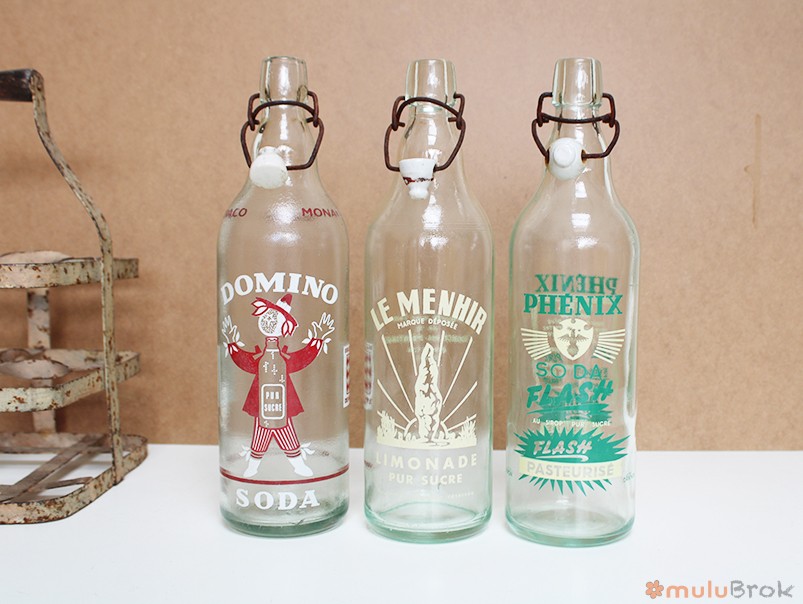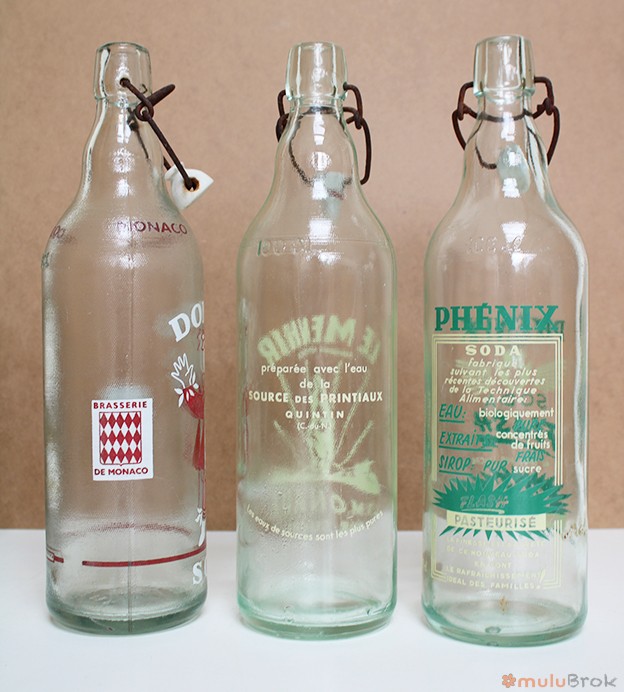 Bouteille en verre avec son attache en métal et sa capsule en porcelaine.