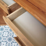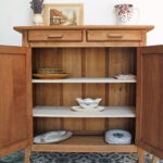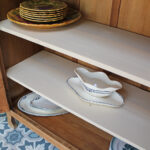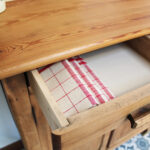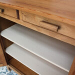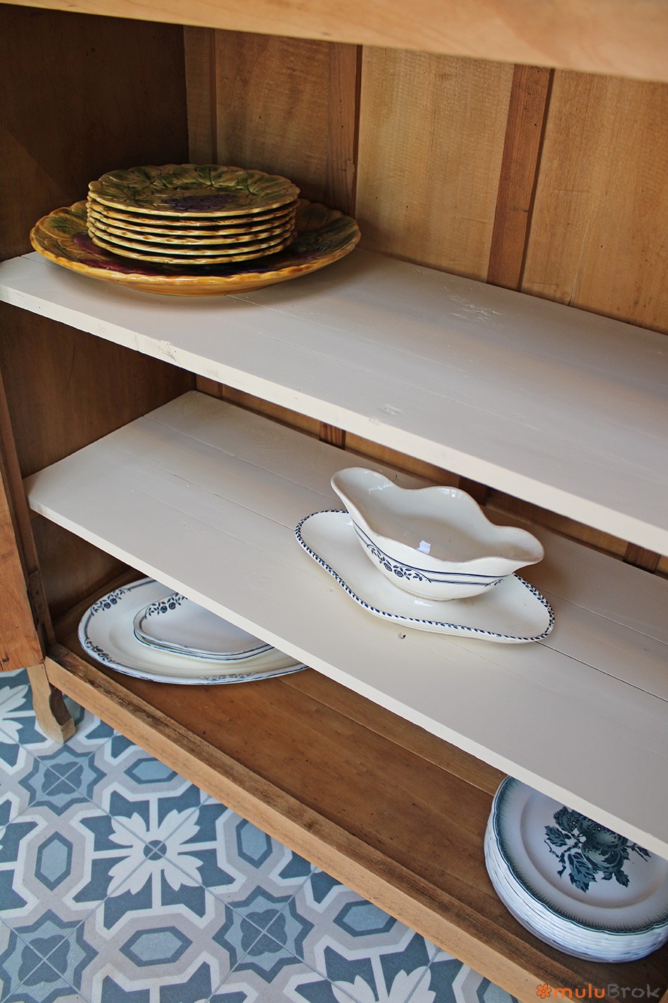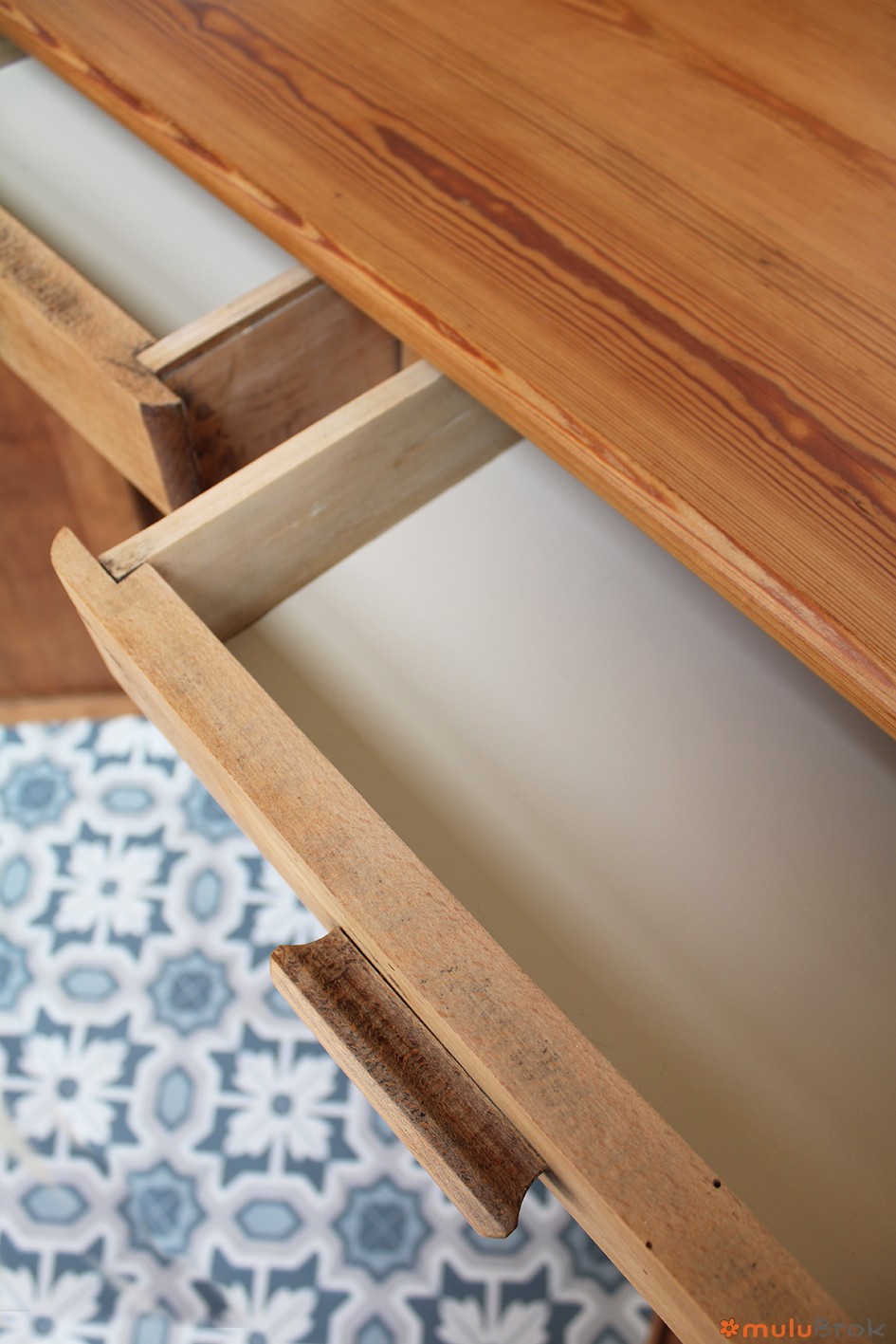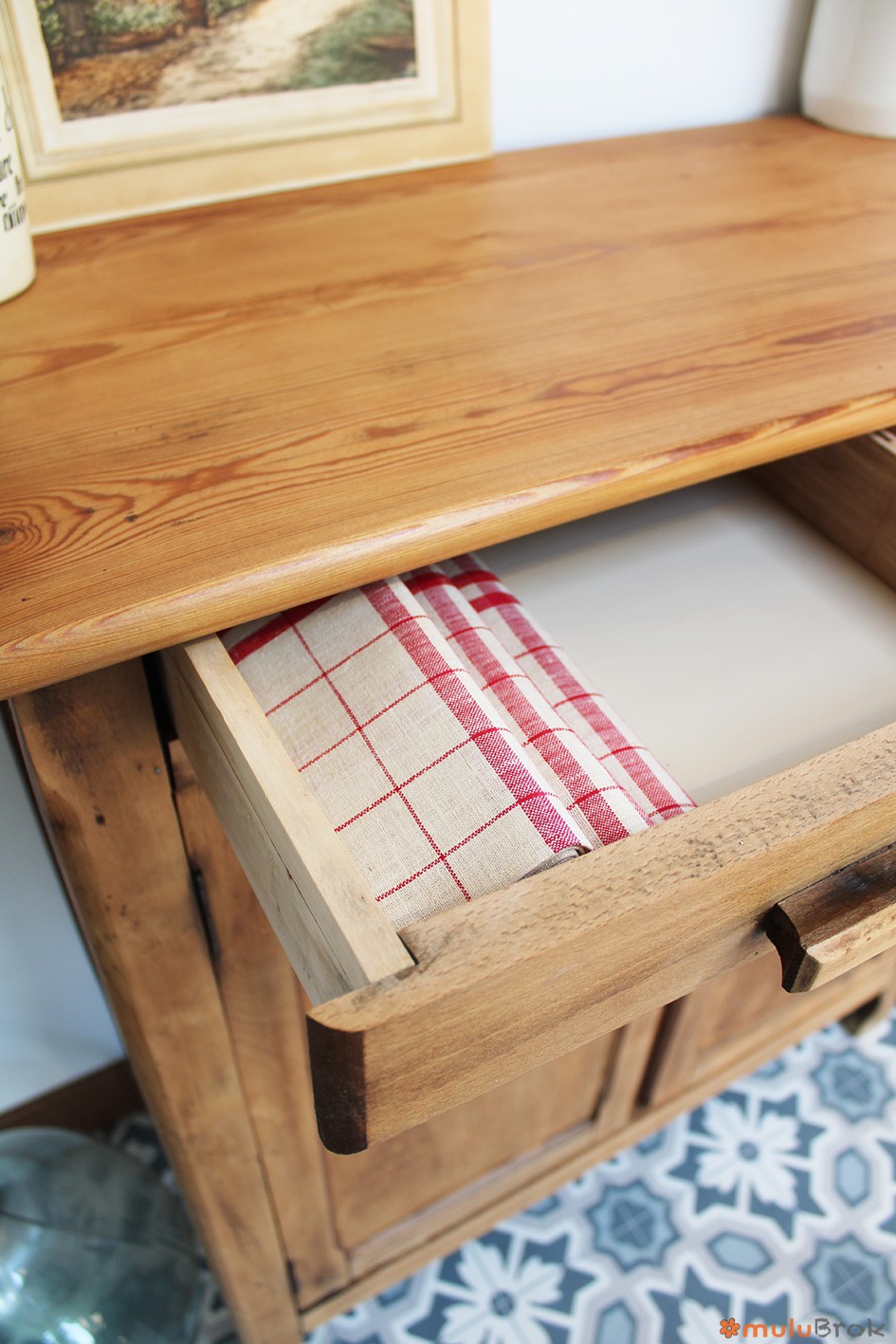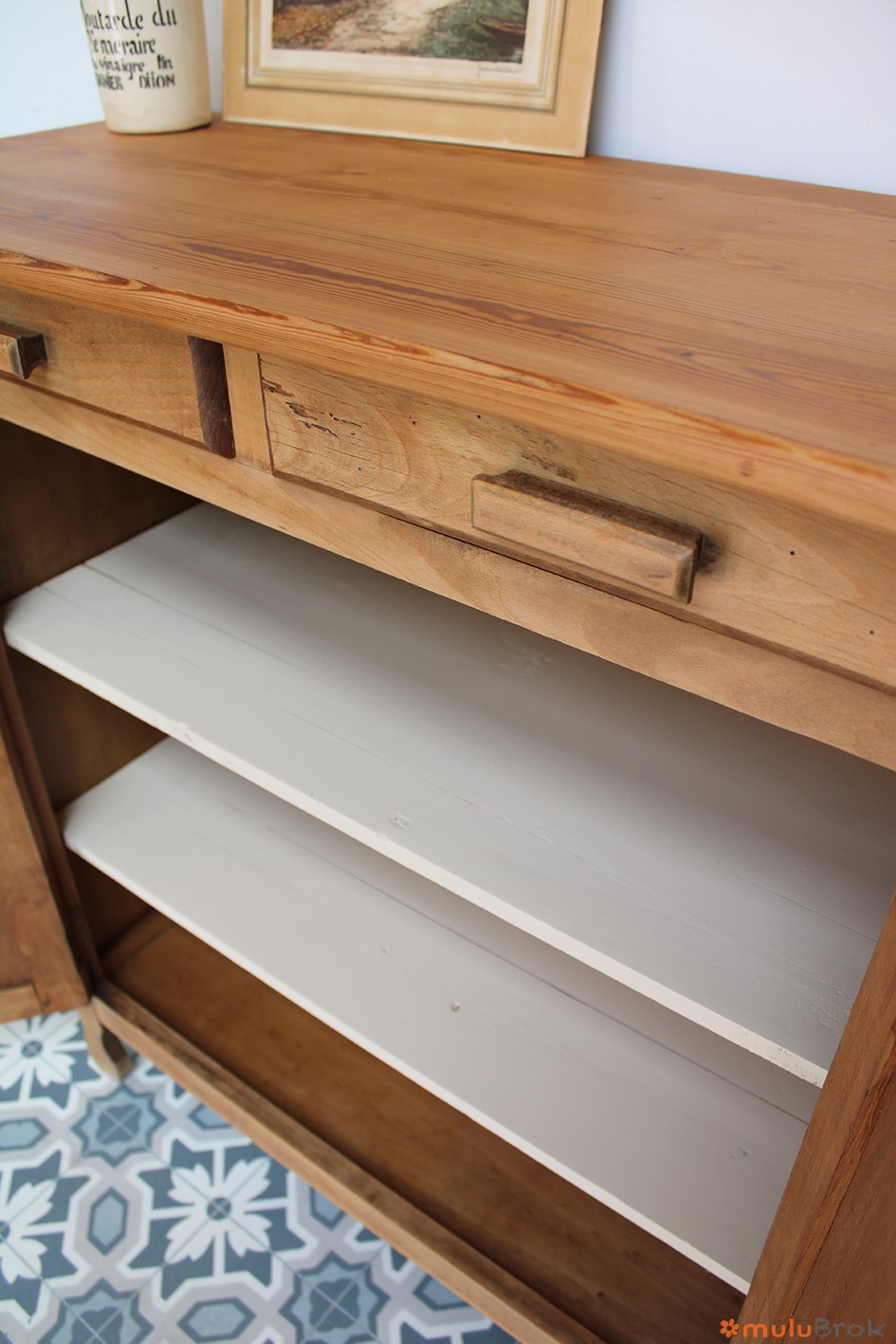les fonds des tiroirs et les étagères sont peints en Toile de jute (produits Libéron).