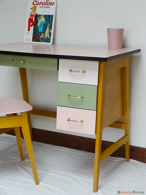 Les façades des tiroirs et le plateau étaient en Formica.