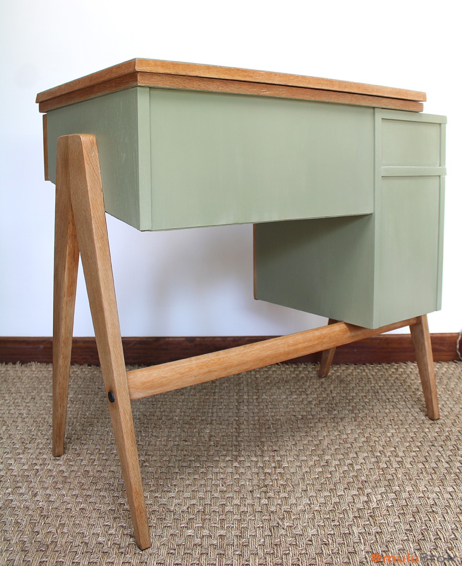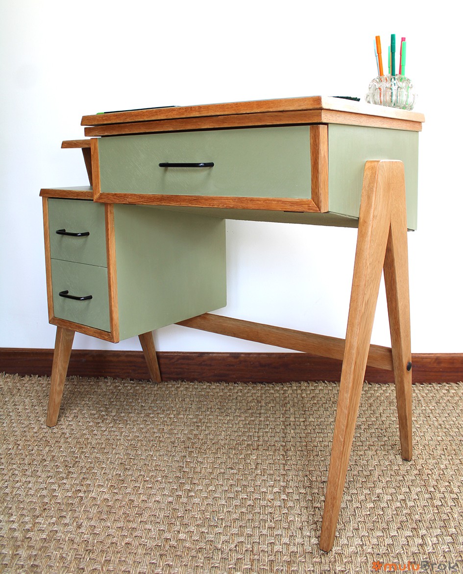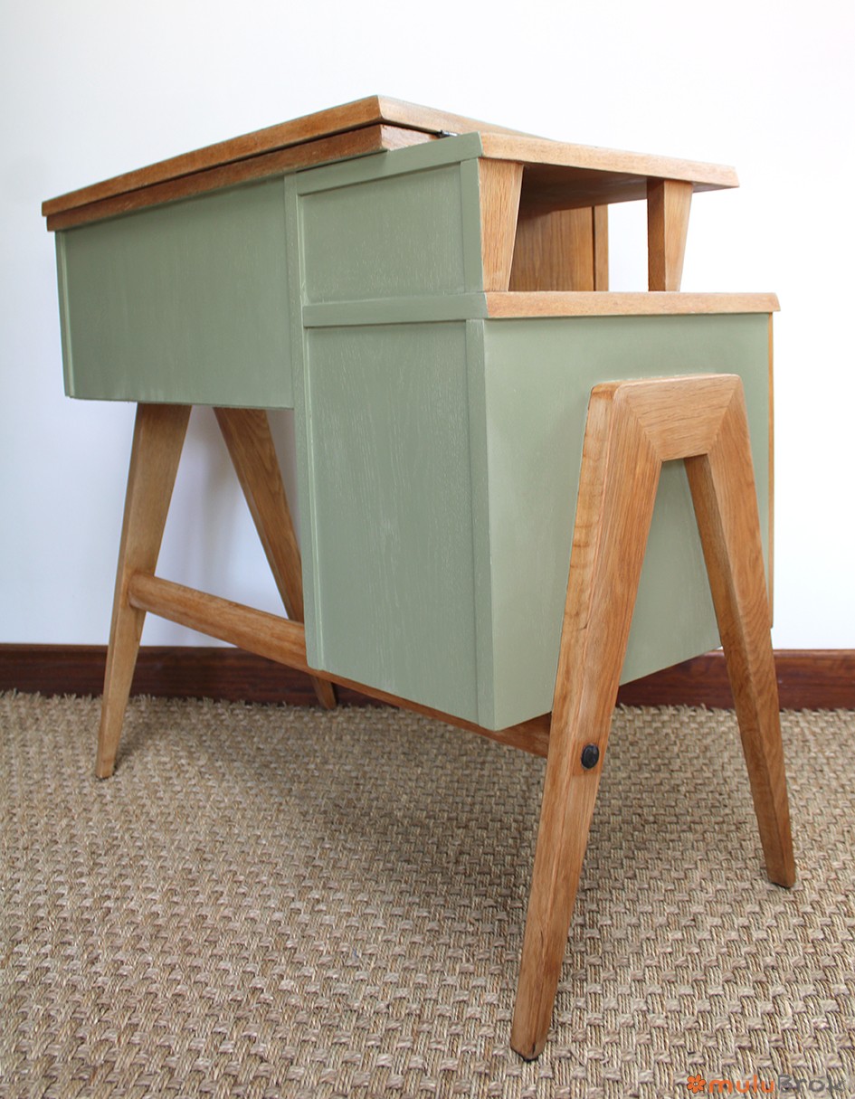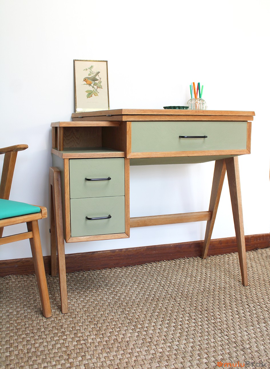 Transformé et rénové en Bureau, coloris Vert de Gris et bois verni (produits Libéron).