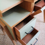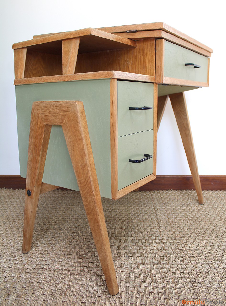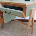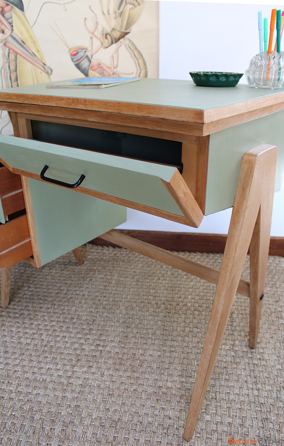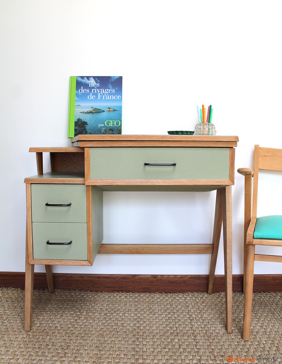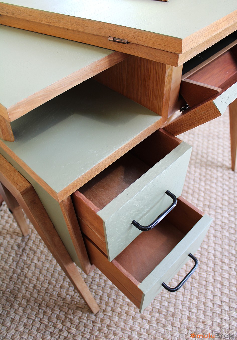 Transformé et rénové en Bureau, coloris Vert de Gris et bois verni (produits Libéron).