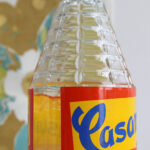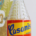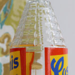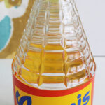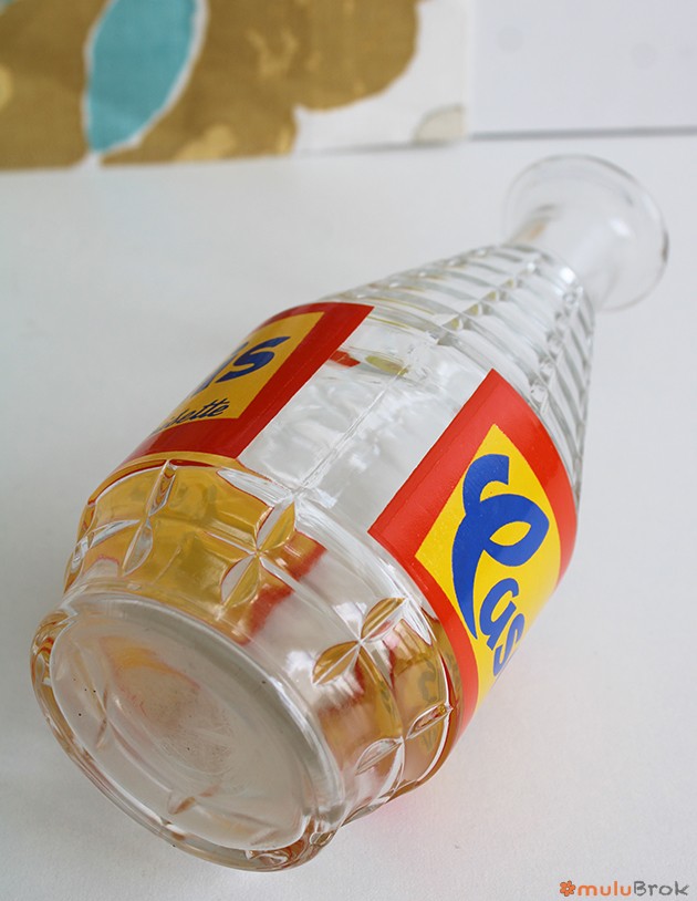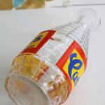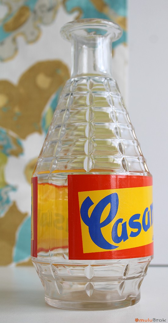 Logo original sur fond jaune, lettrage bleu et entourage rouge.