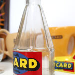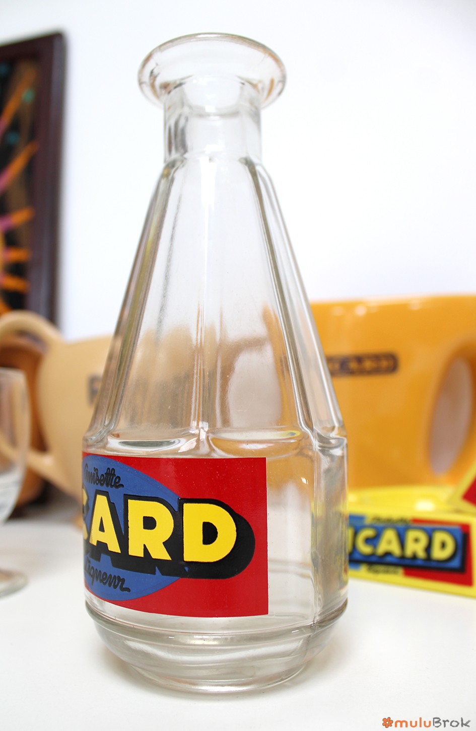Logo original sur fond bleu foncé et rouge, lettrage jaune et entourage noir.