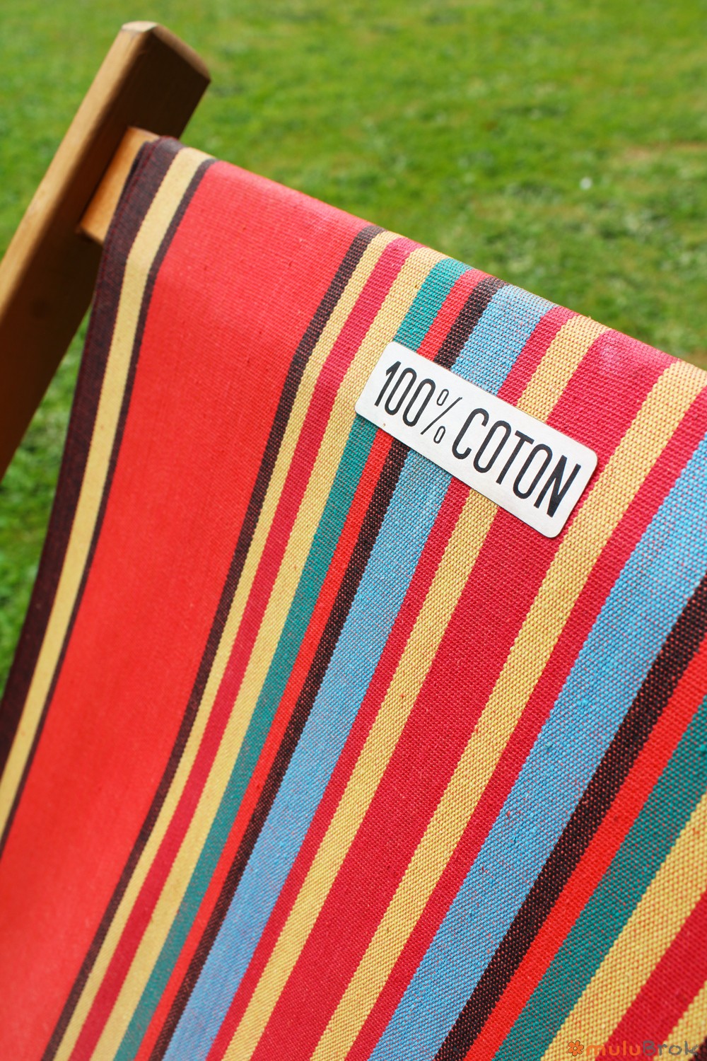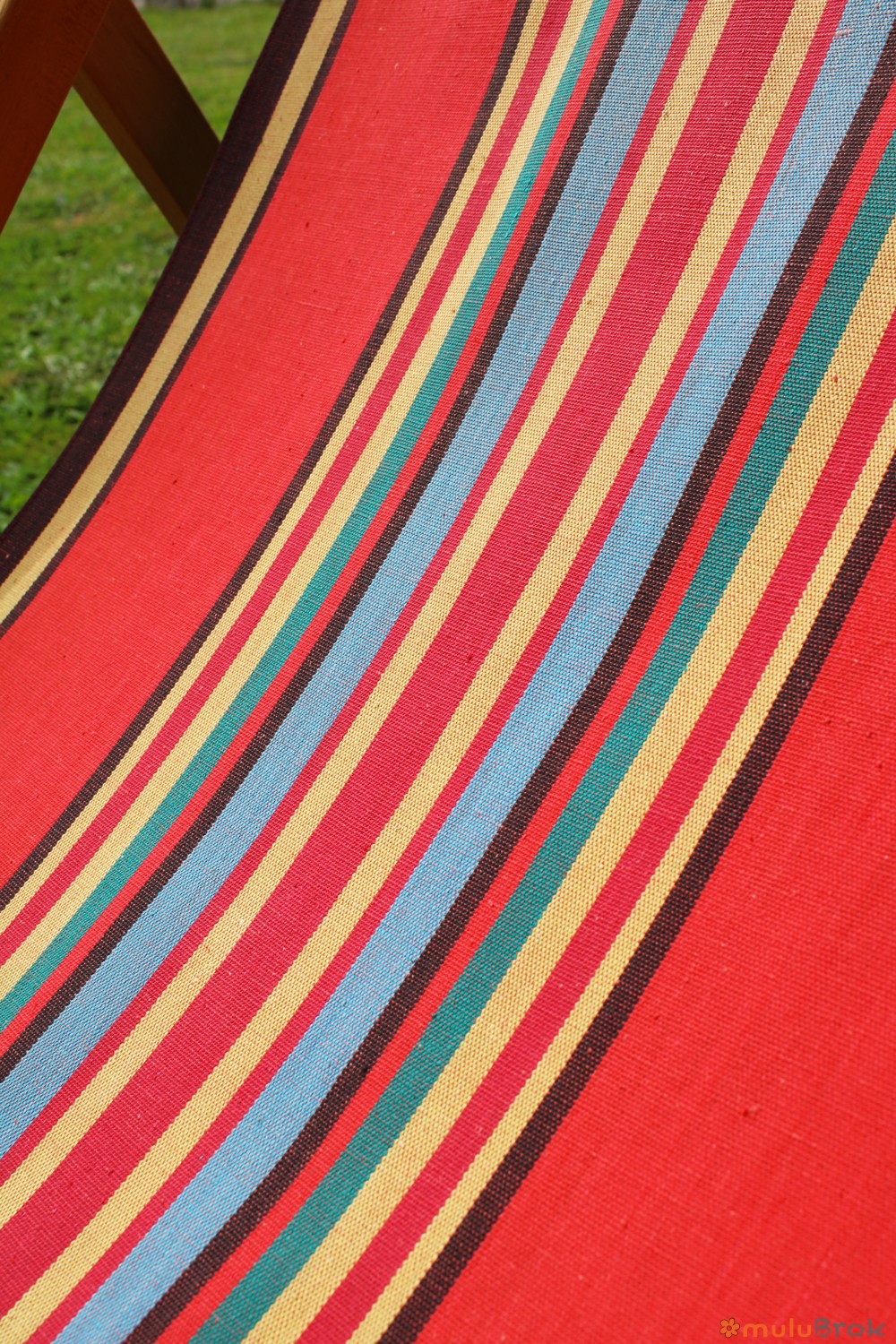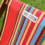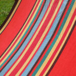 Tissu 100% coton. Fond rouge avec rayures colorées.