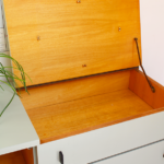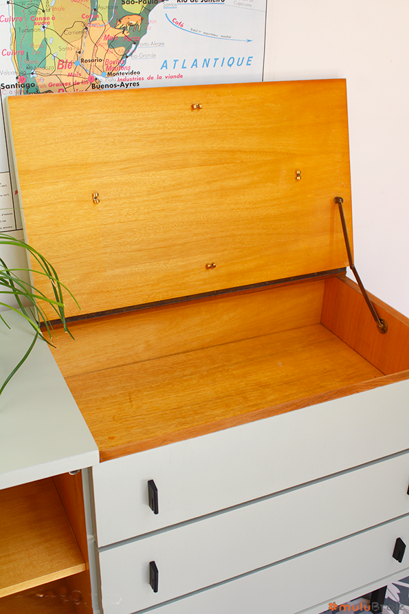 Côté gauche : Commode 2 tiroirs bas, dessus abattant à soulever.