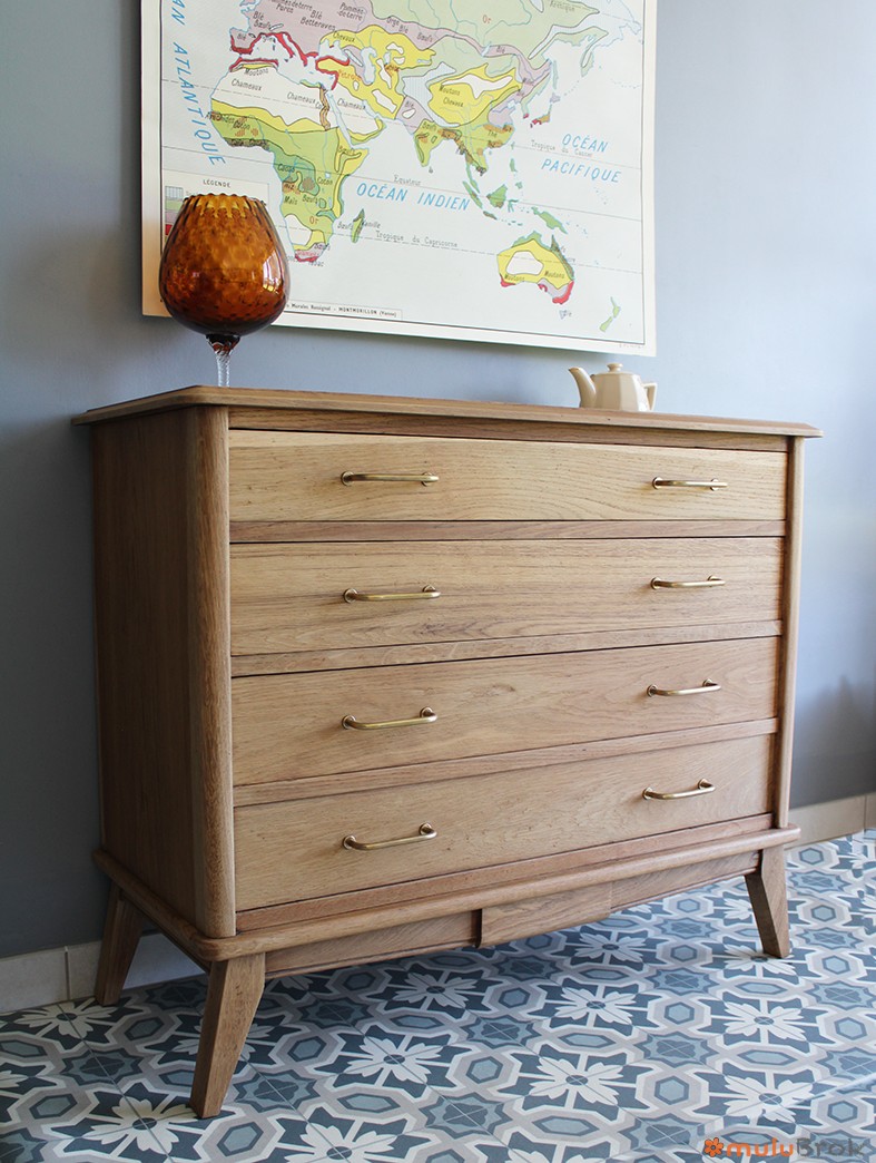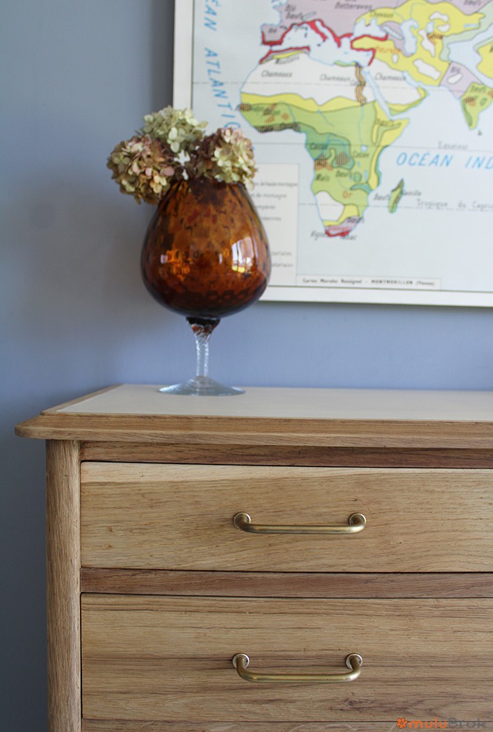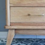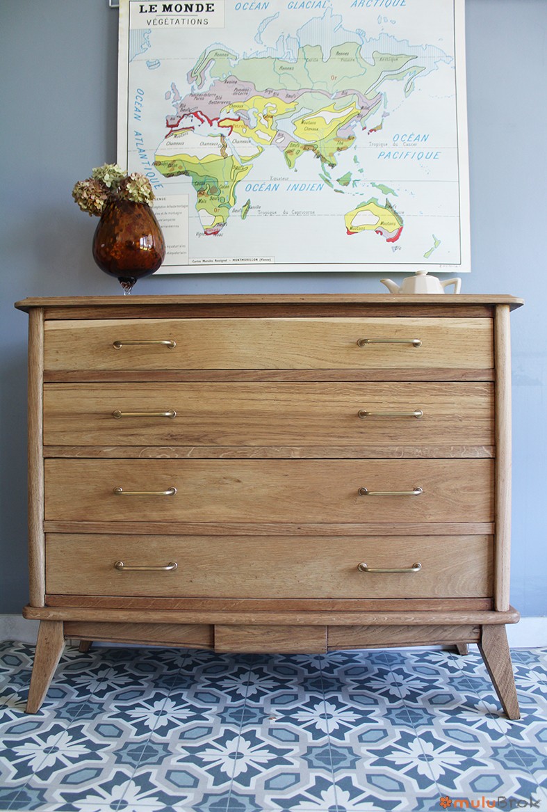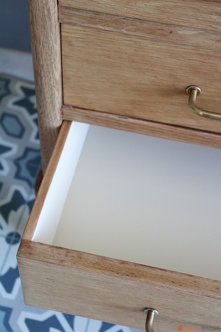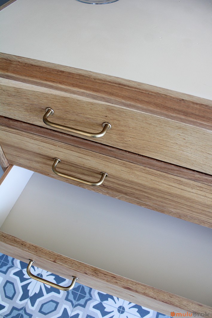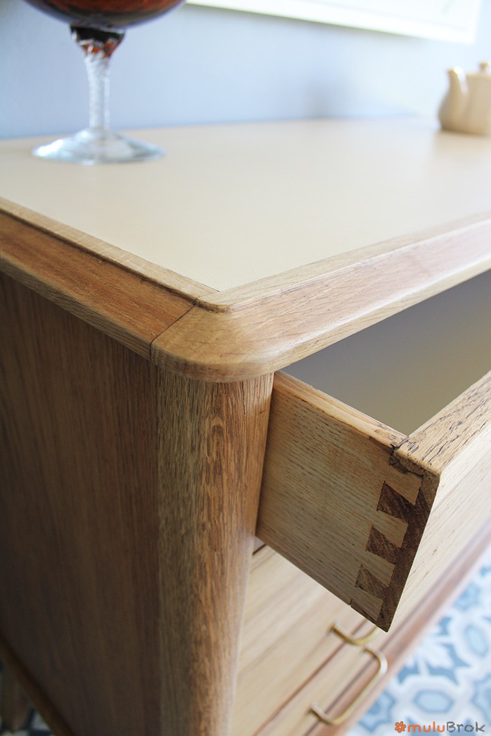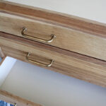 4 tiroirs finition queue d’aronde, avec poignées en laiton.