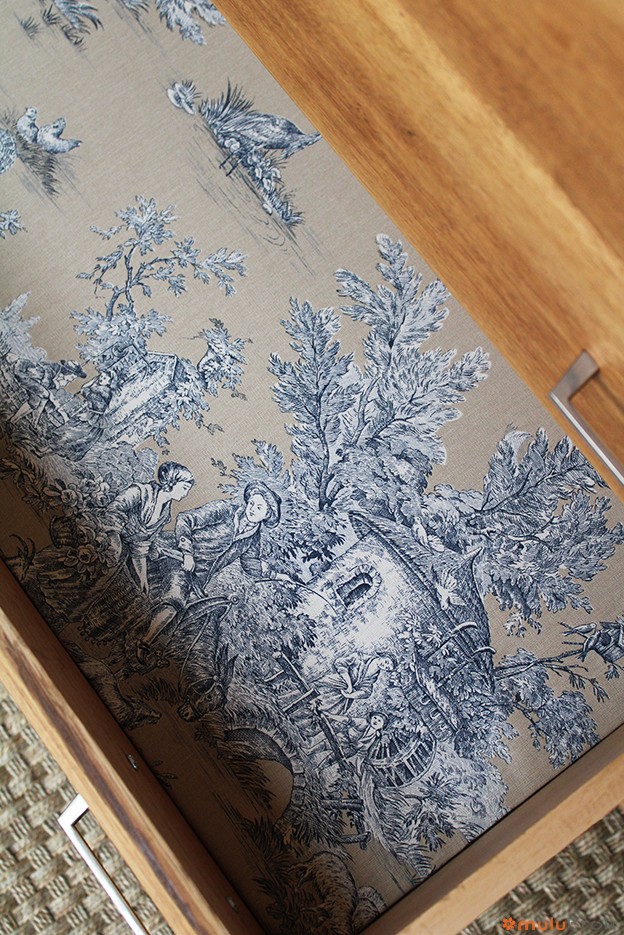 L’intérieur des tiroirs est tapissé d’un tissu : Toile de Jouy.