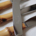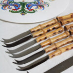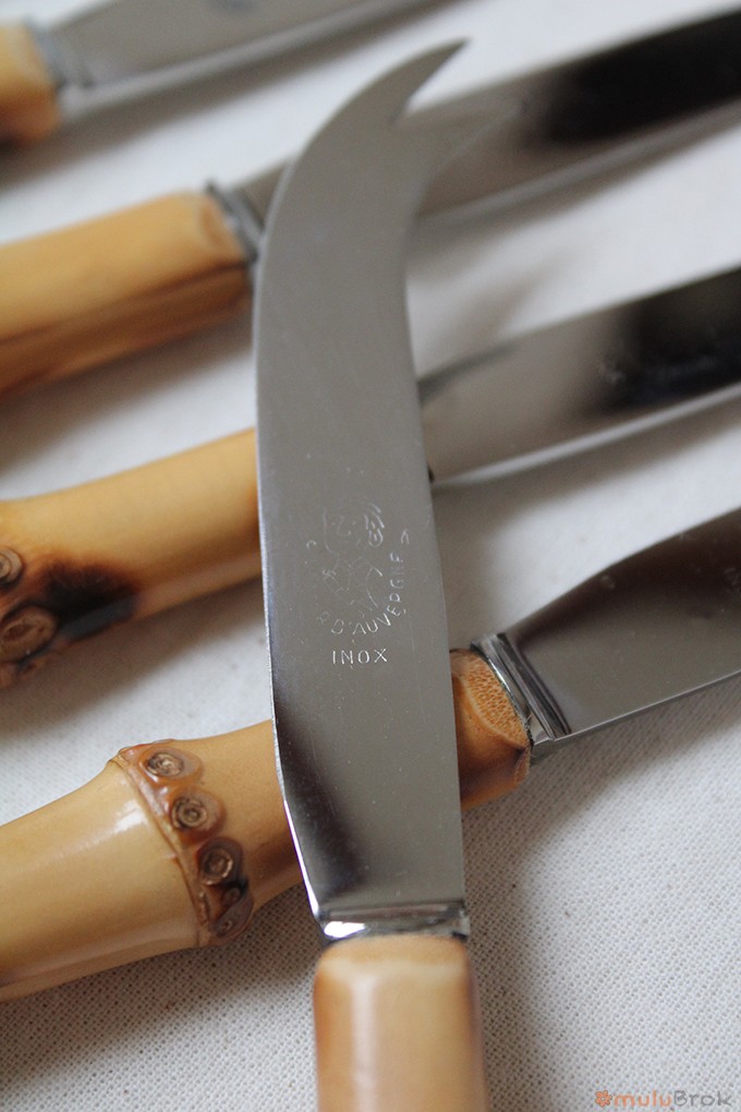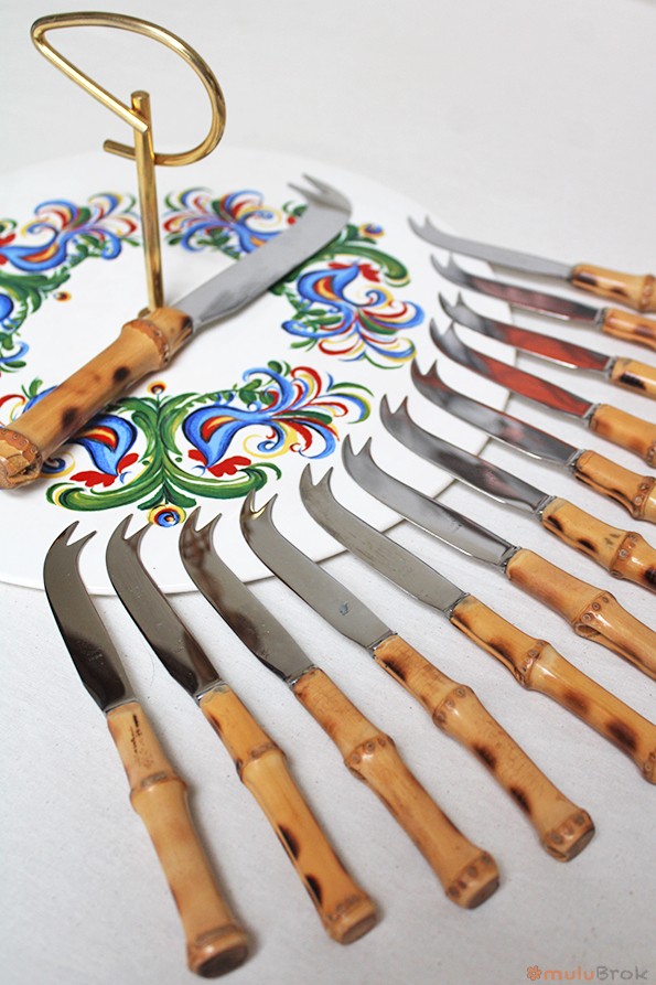 Anciens couteaux à fromages avec manche en bambou.