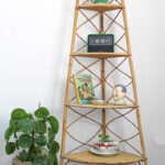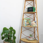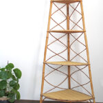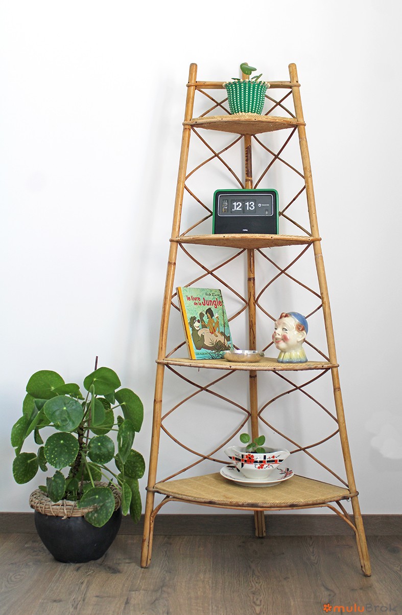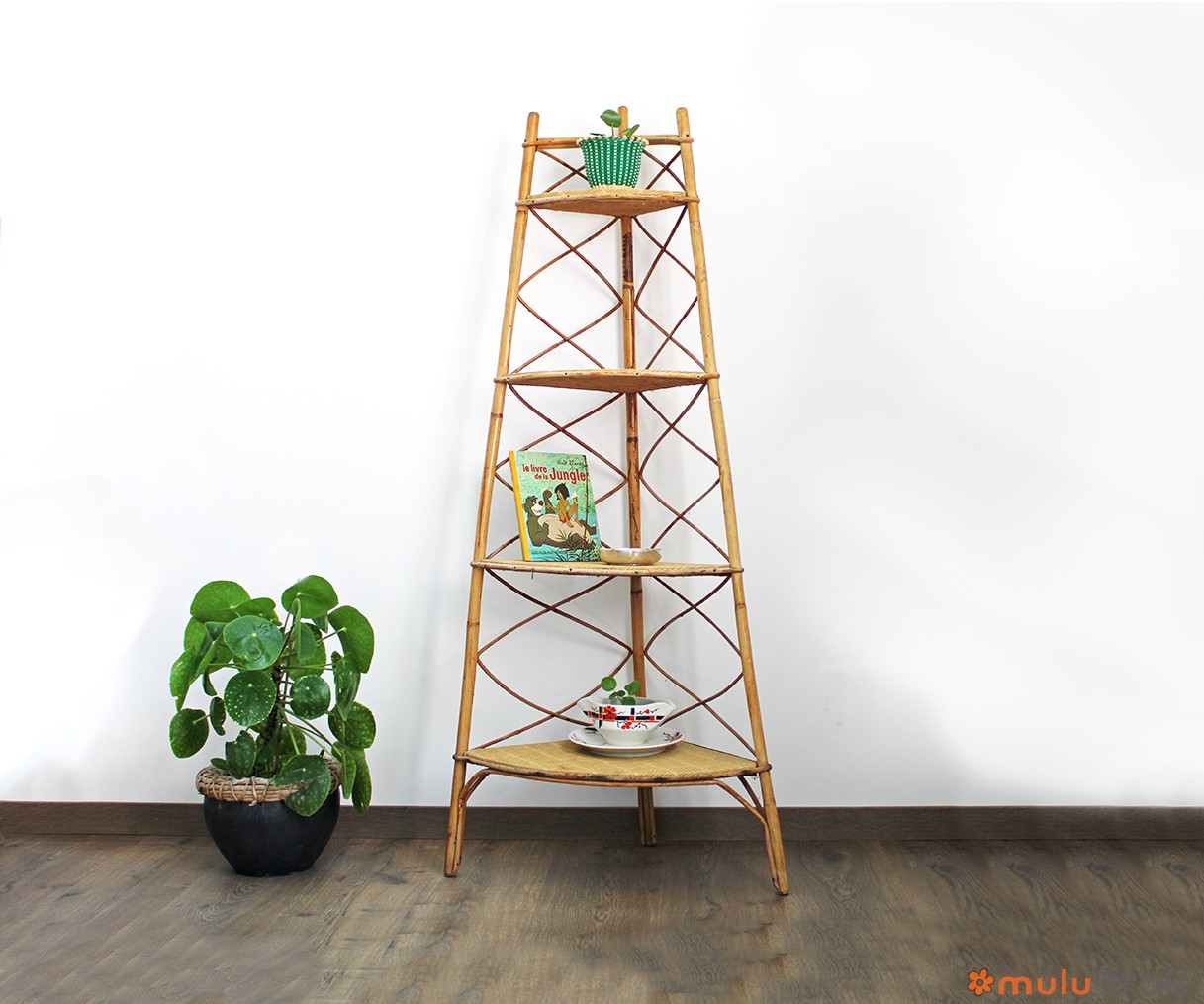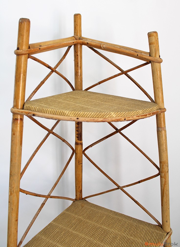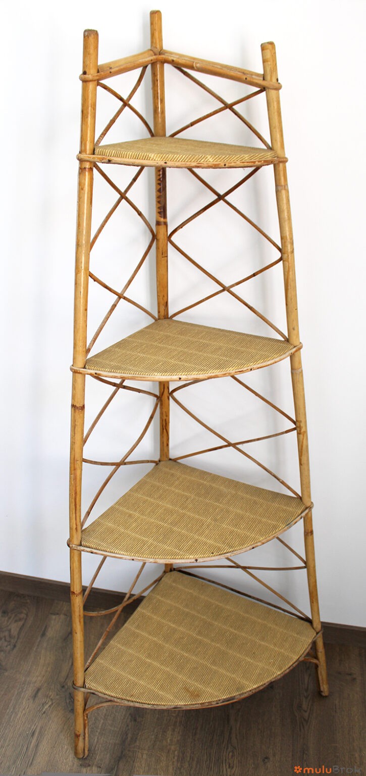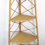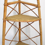 Ancienne étagère d’angle en rotin, sur pied, grand modèle.