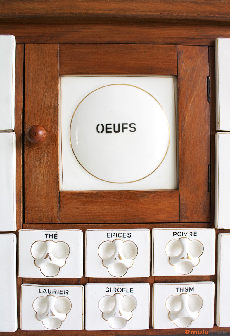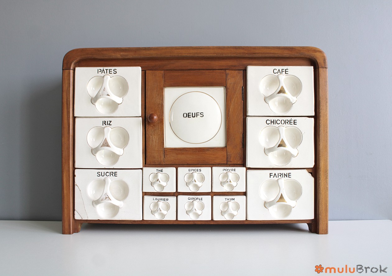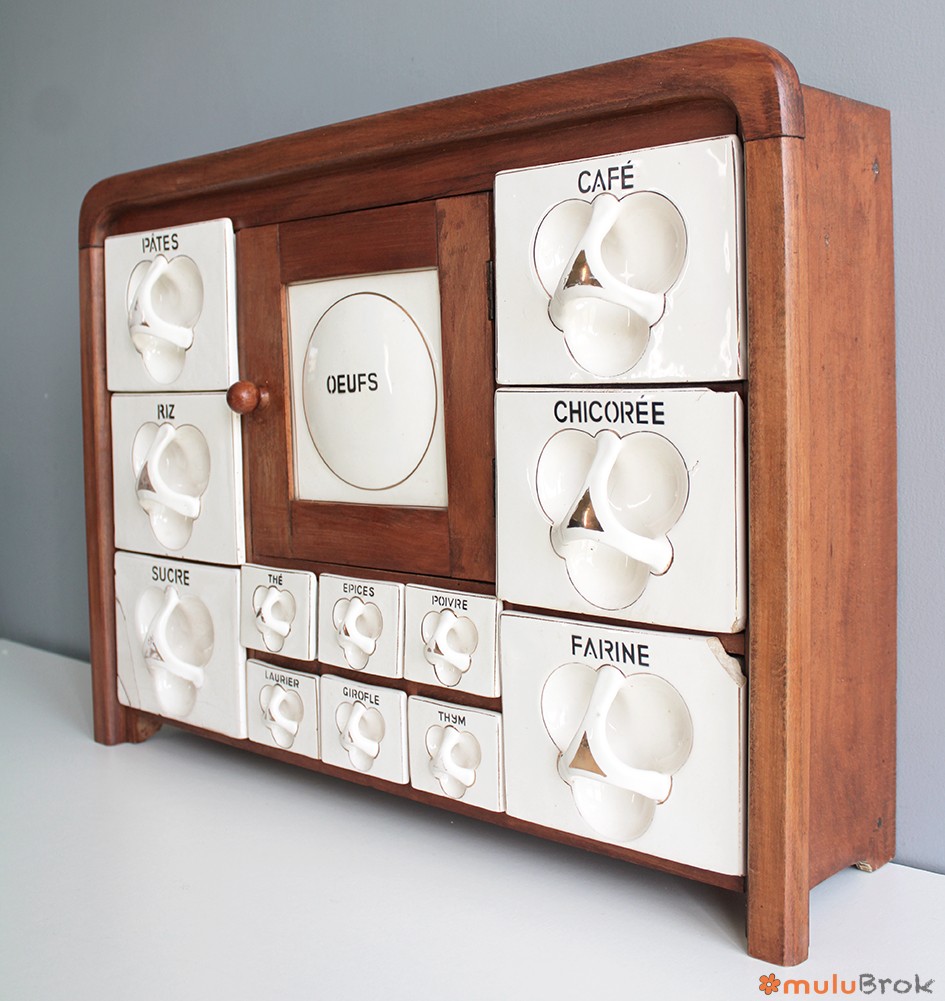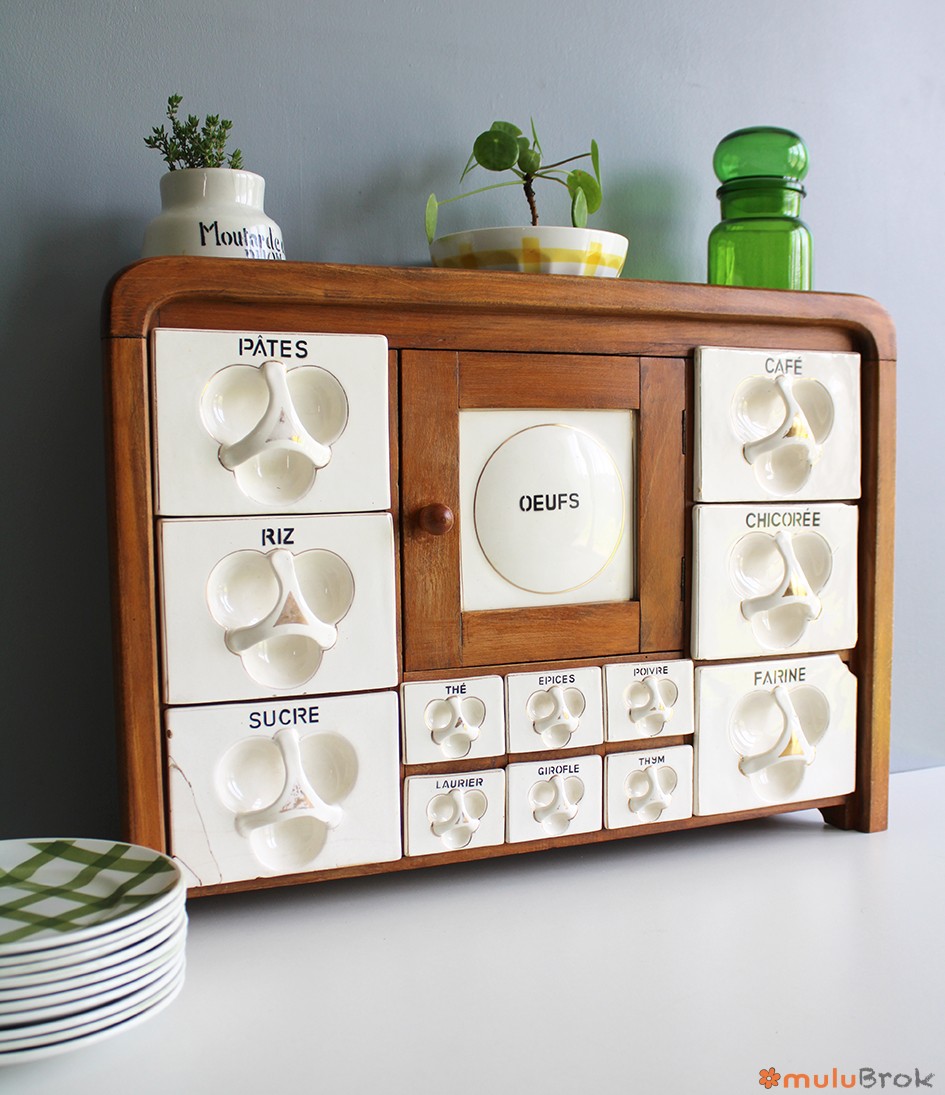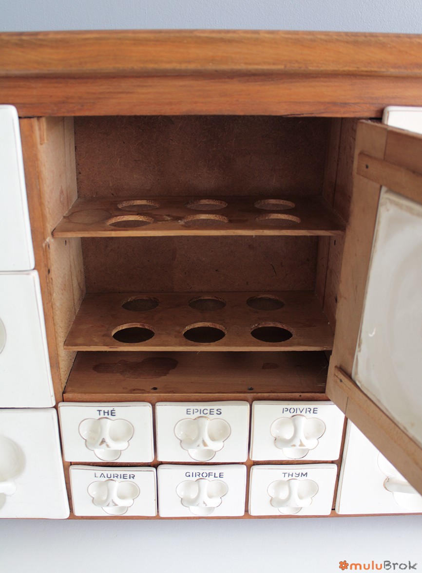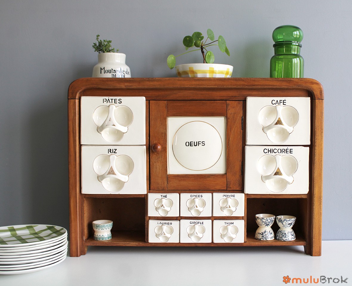 Ancien meuble en bois avec tiroirs à épices et porte oeufs.