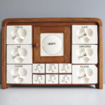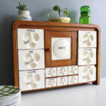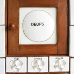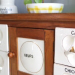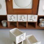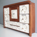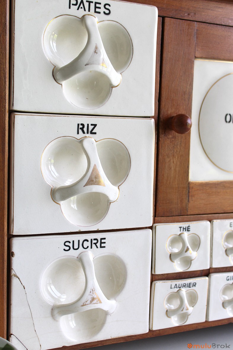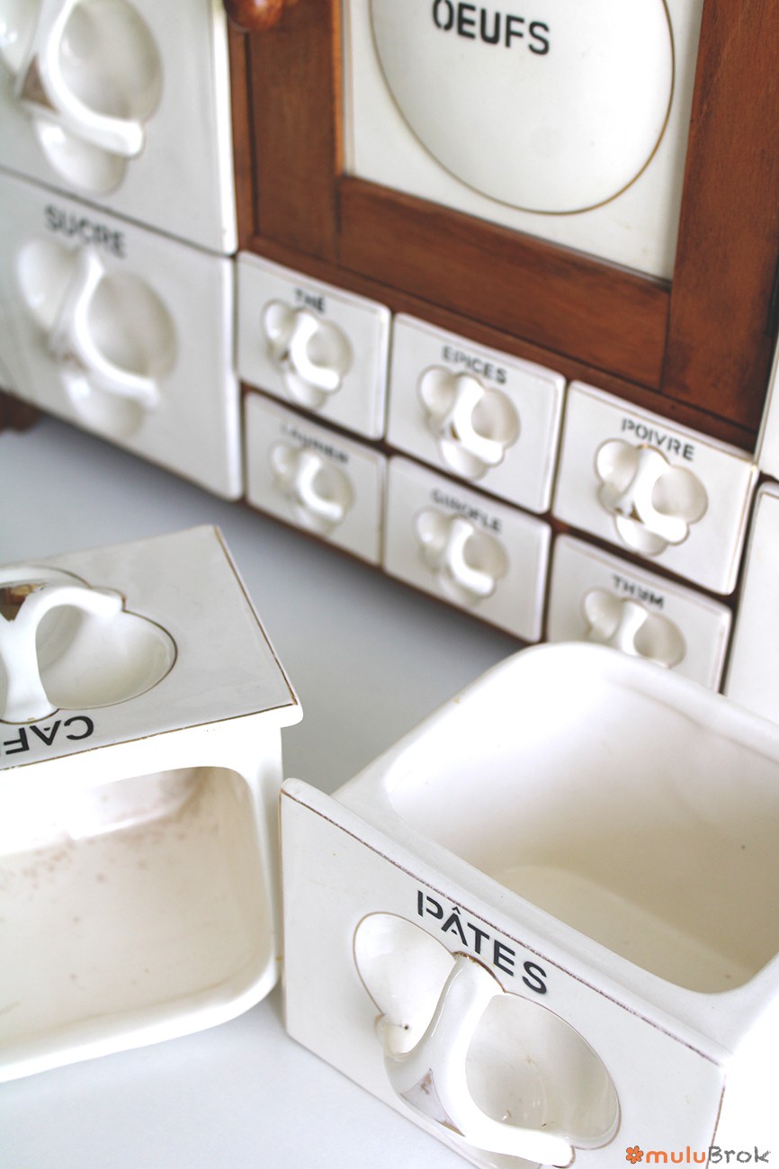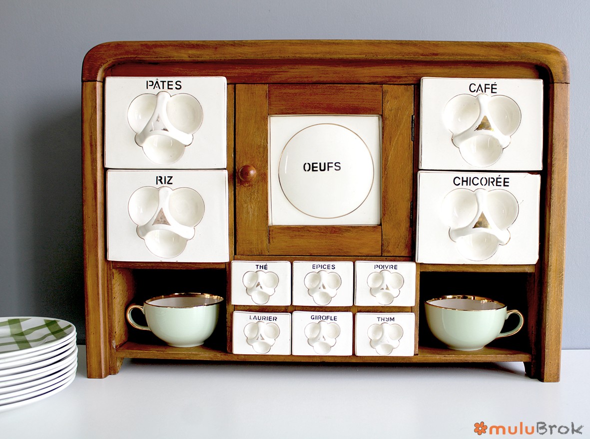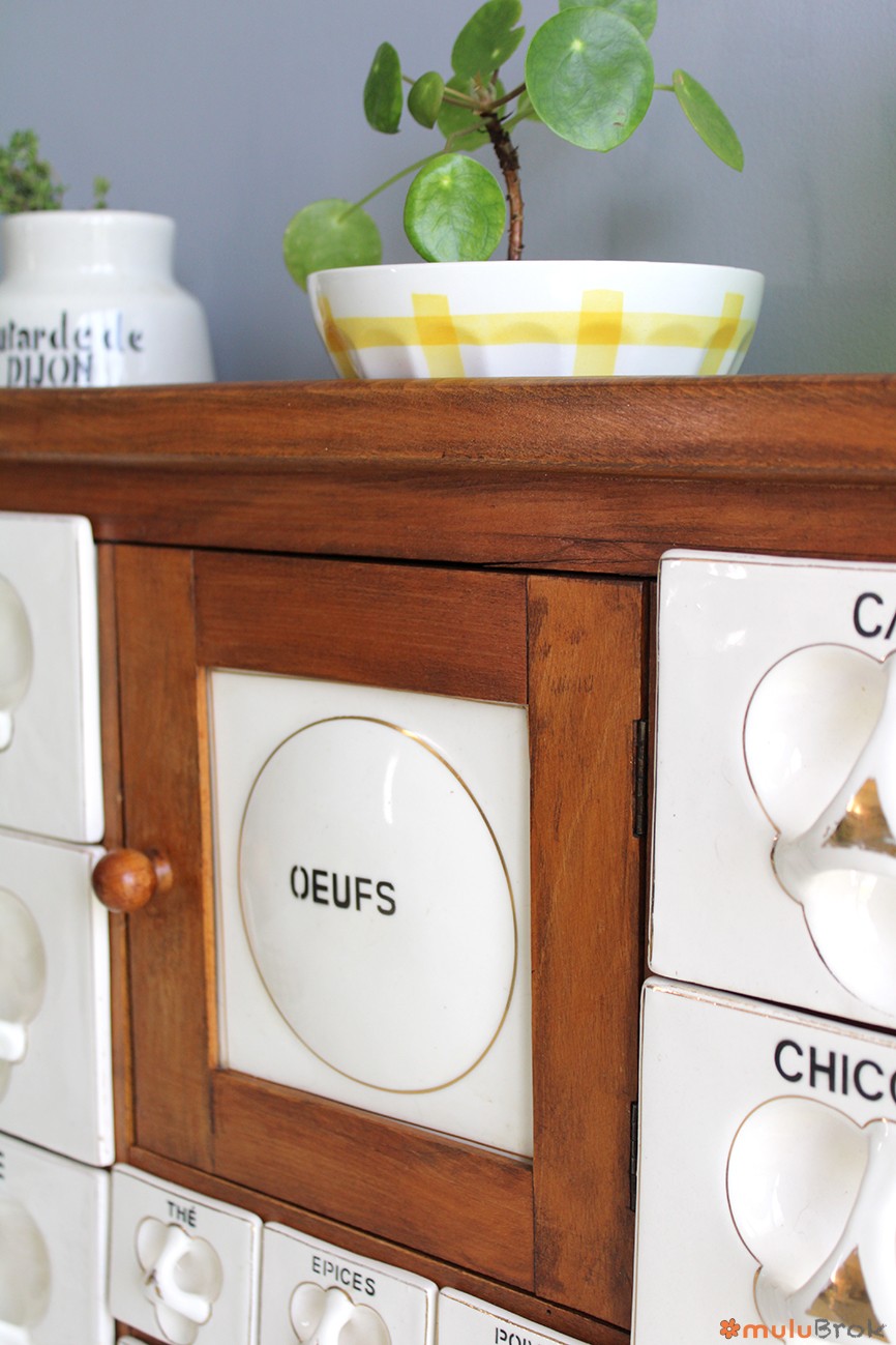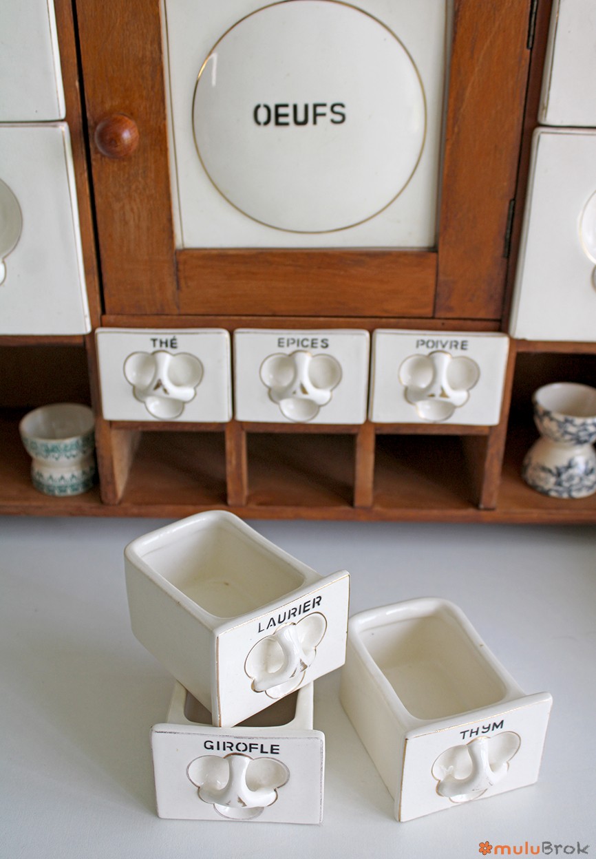 Ancien meuble en bois avec tiroirs à épices et porte oeufs.