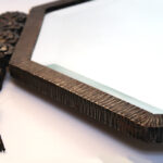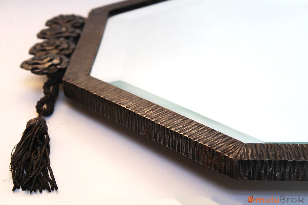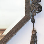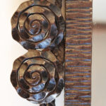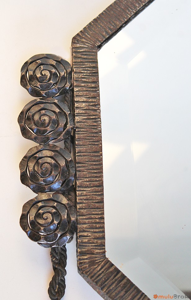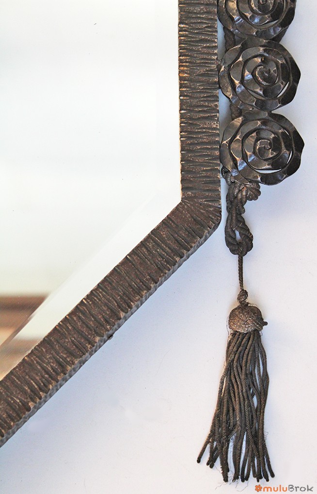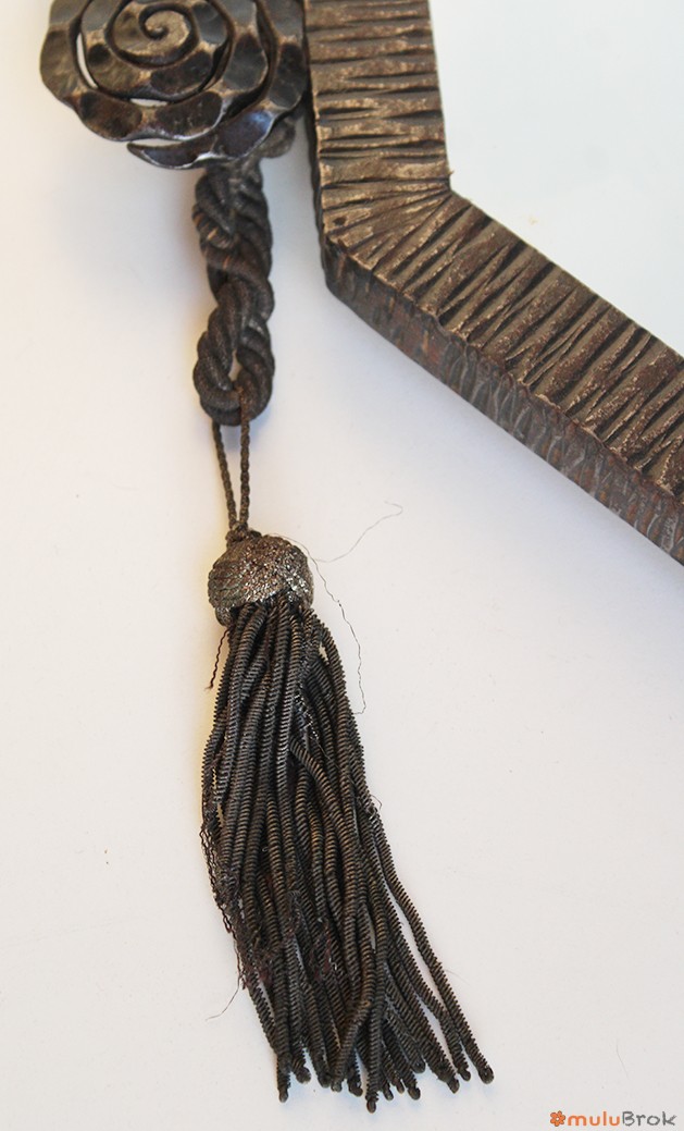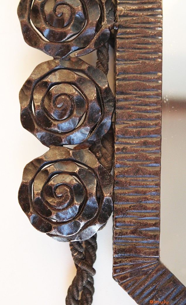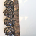 Cadre et fleurs en métal, pompons en fils métalliques.