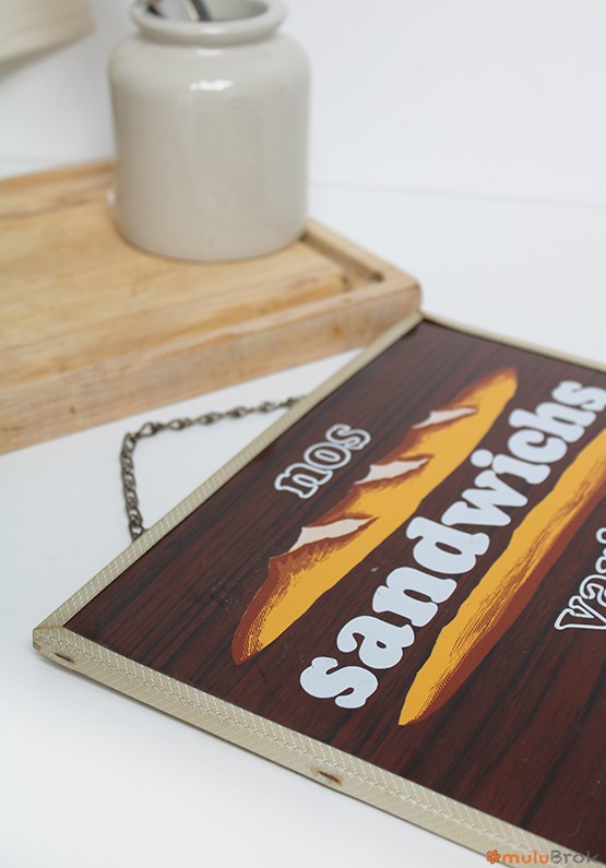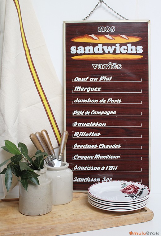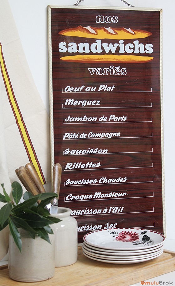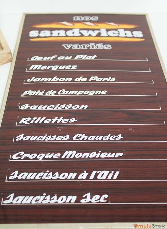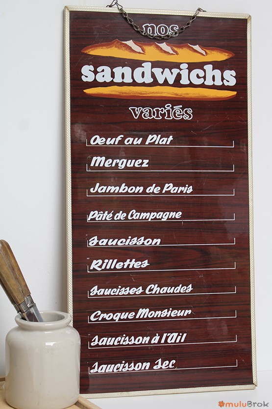 Ancien panneau de commerce, tarif des sandwichs variés.