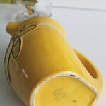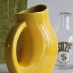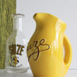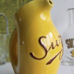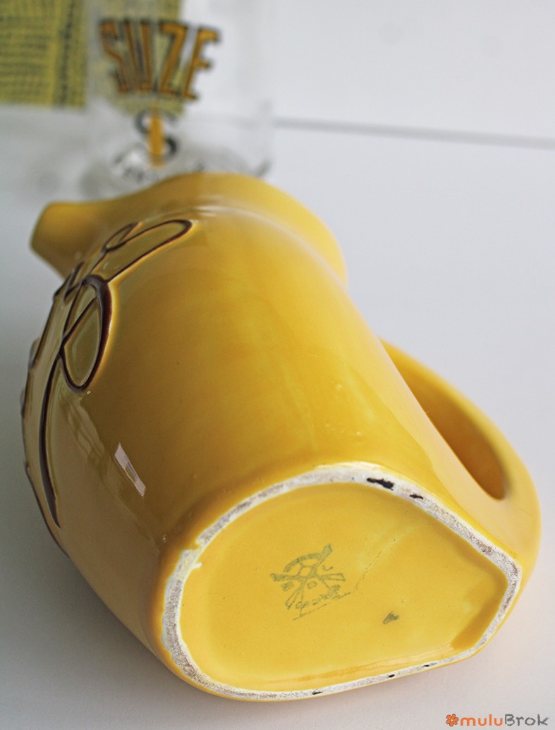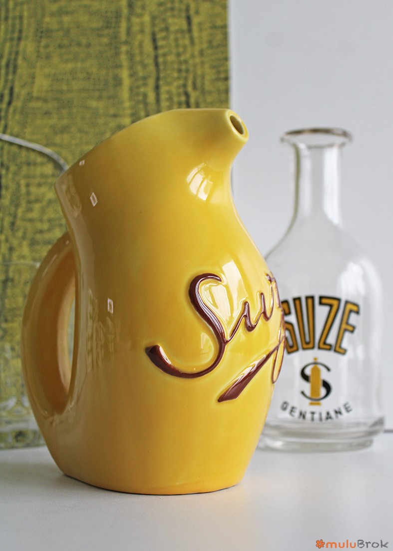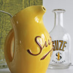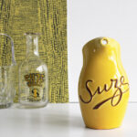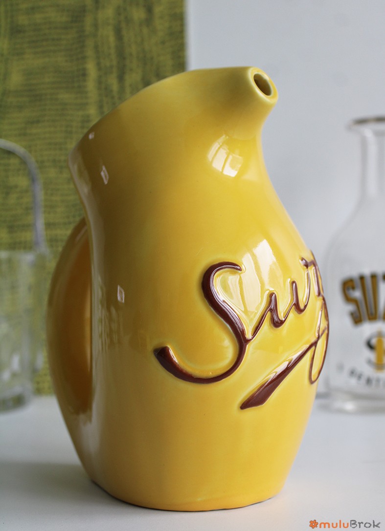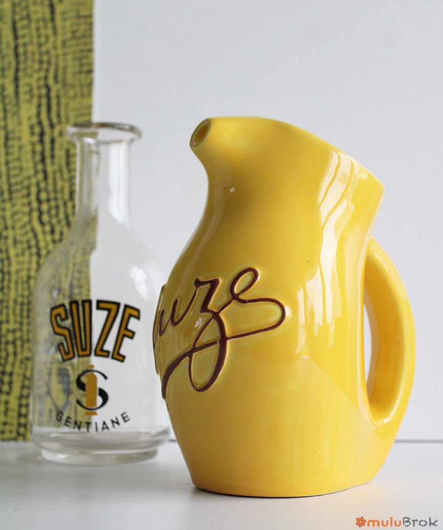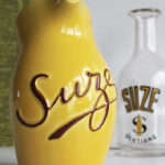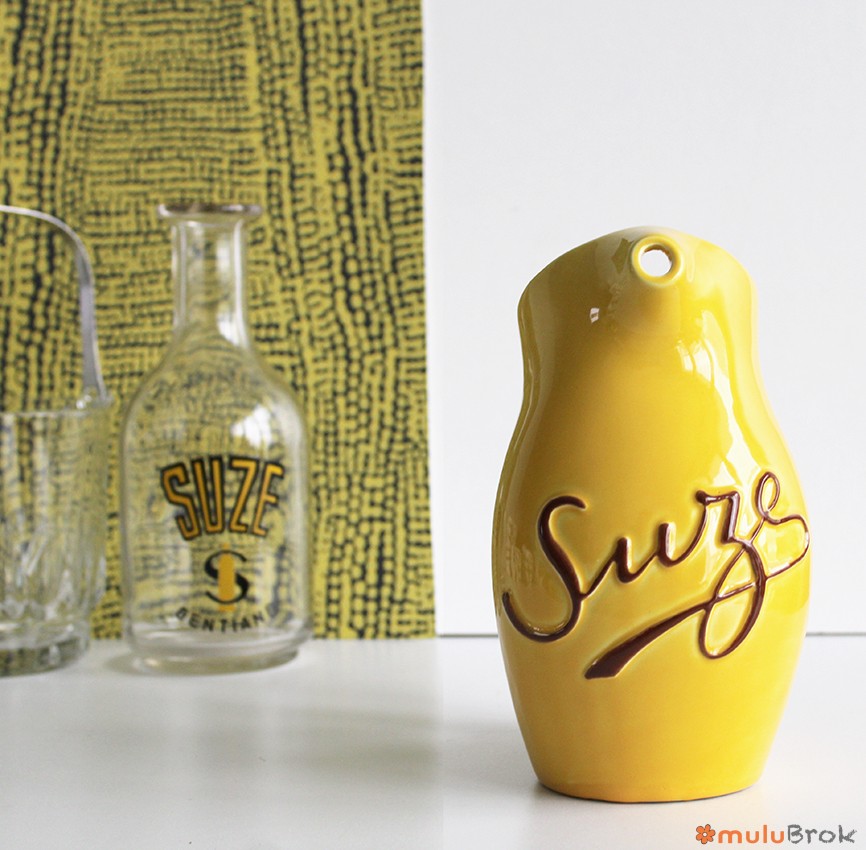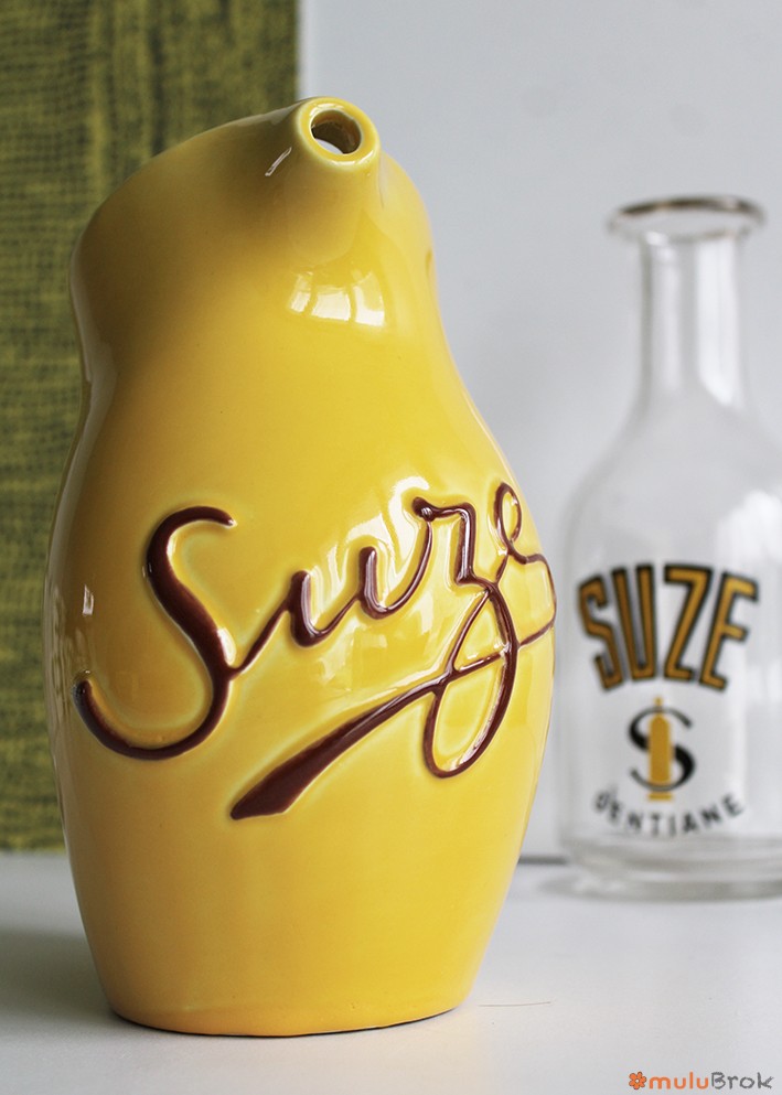 Beau logo Suze en relief marron, sur fond jaune orangé.