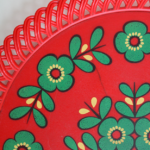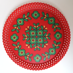 Fleurs jaunes et vertes stylisées sur fond rouge.