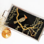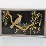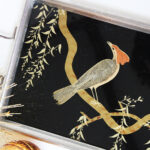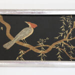 Joli motif japonais : Oiseau pailleté sur branche et feuilles dorées sur fond noir.