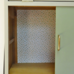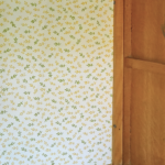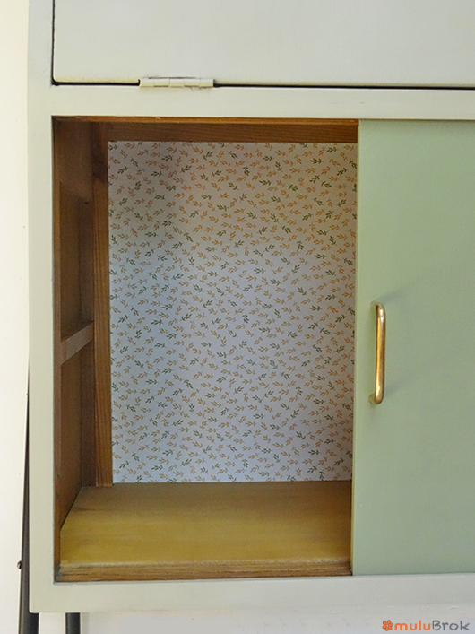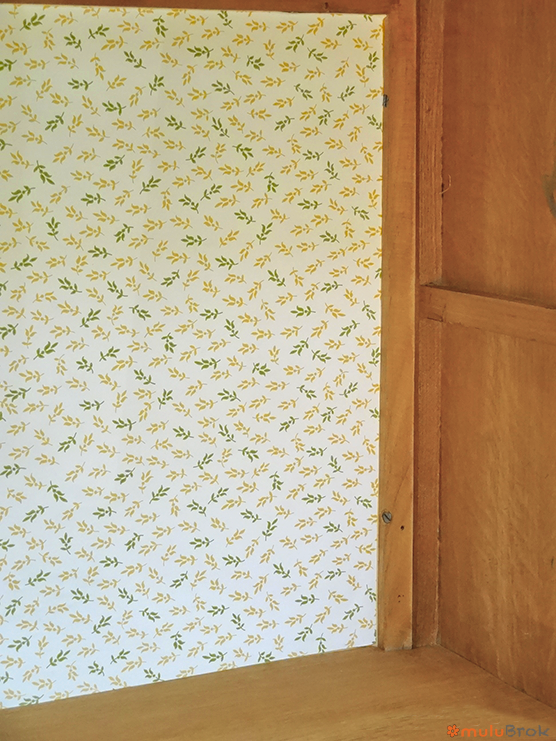 L’intérieur est teinté bois, le fond est tapissé d’un papier (motif petites feuilles).
