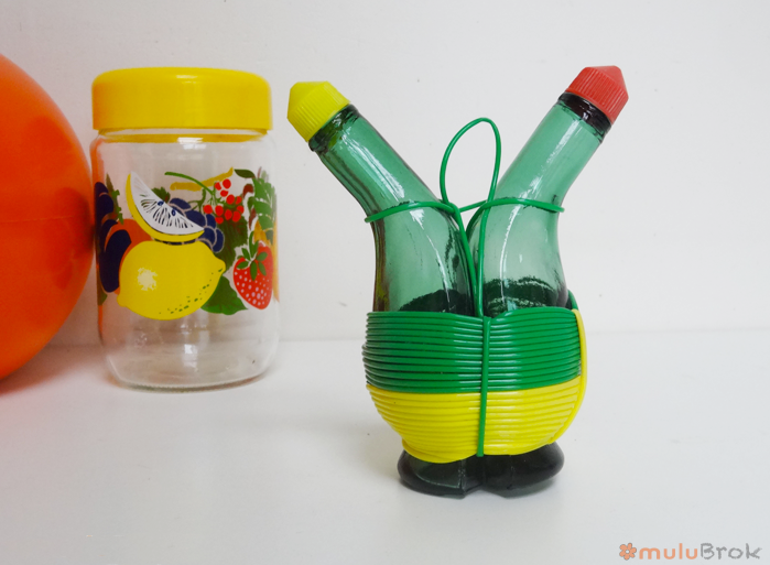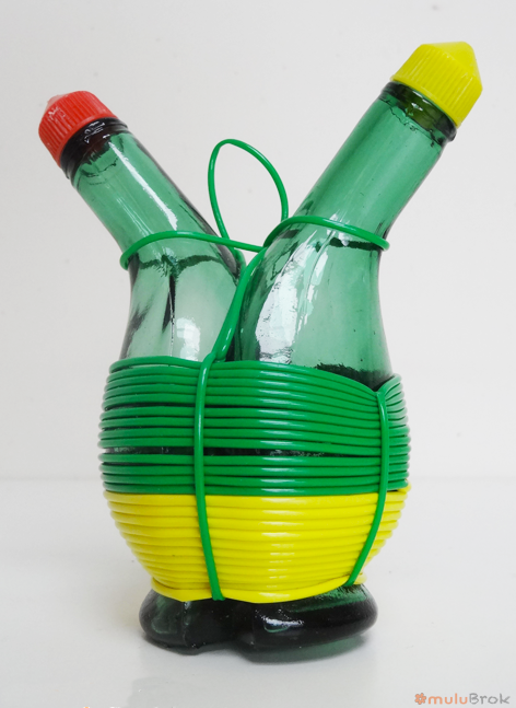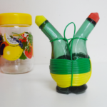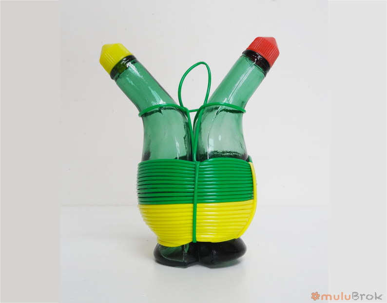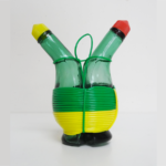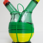 2 flacons en verre reliés par des fils de scoubidou jaunes et verts.