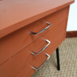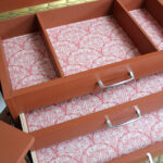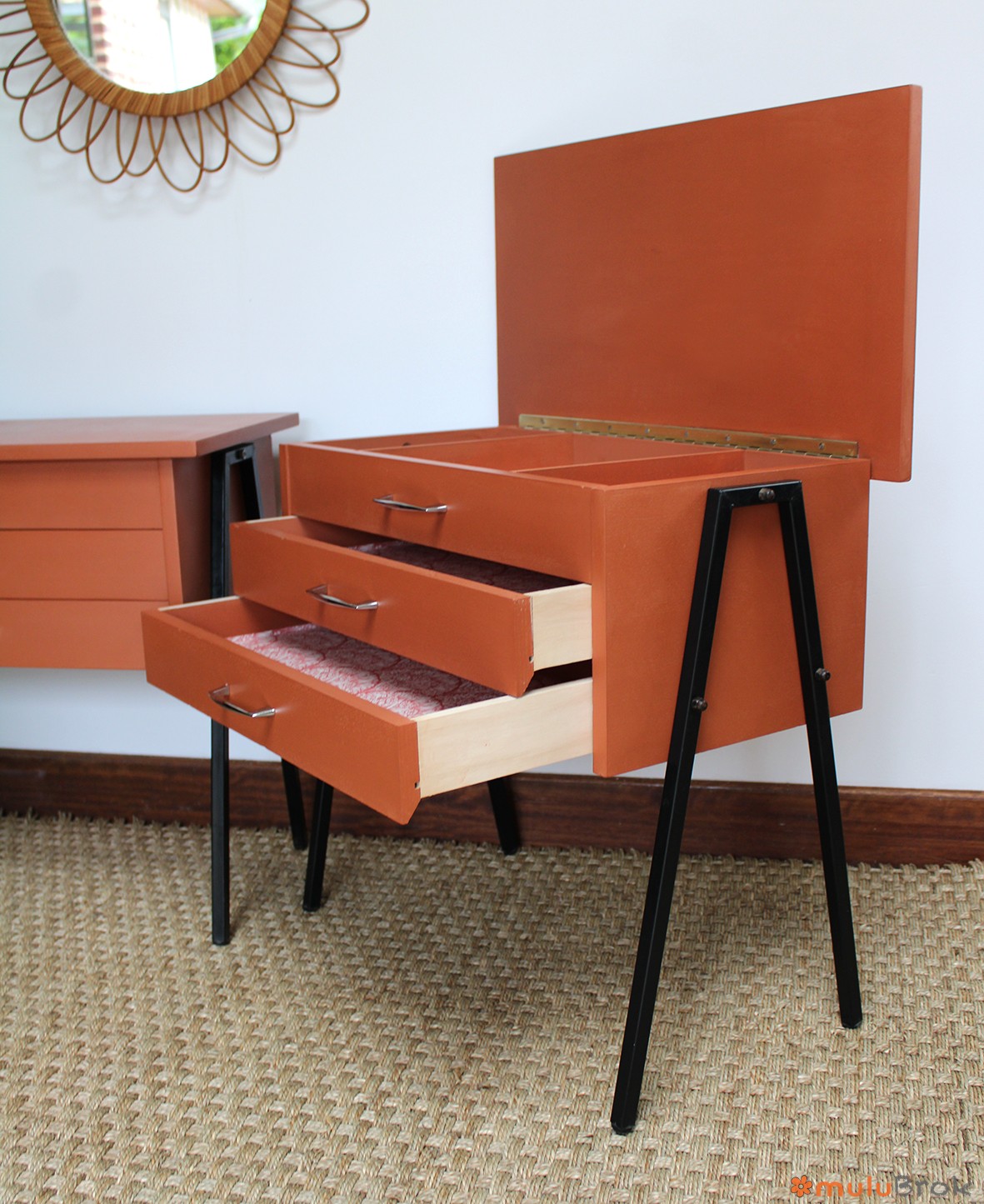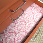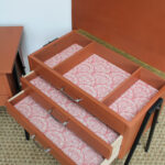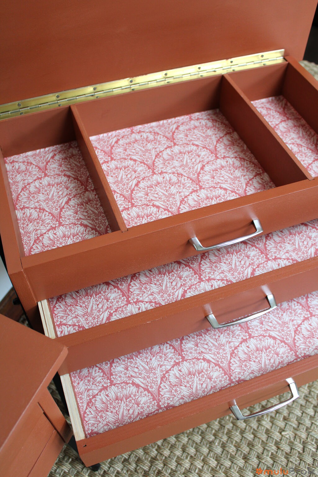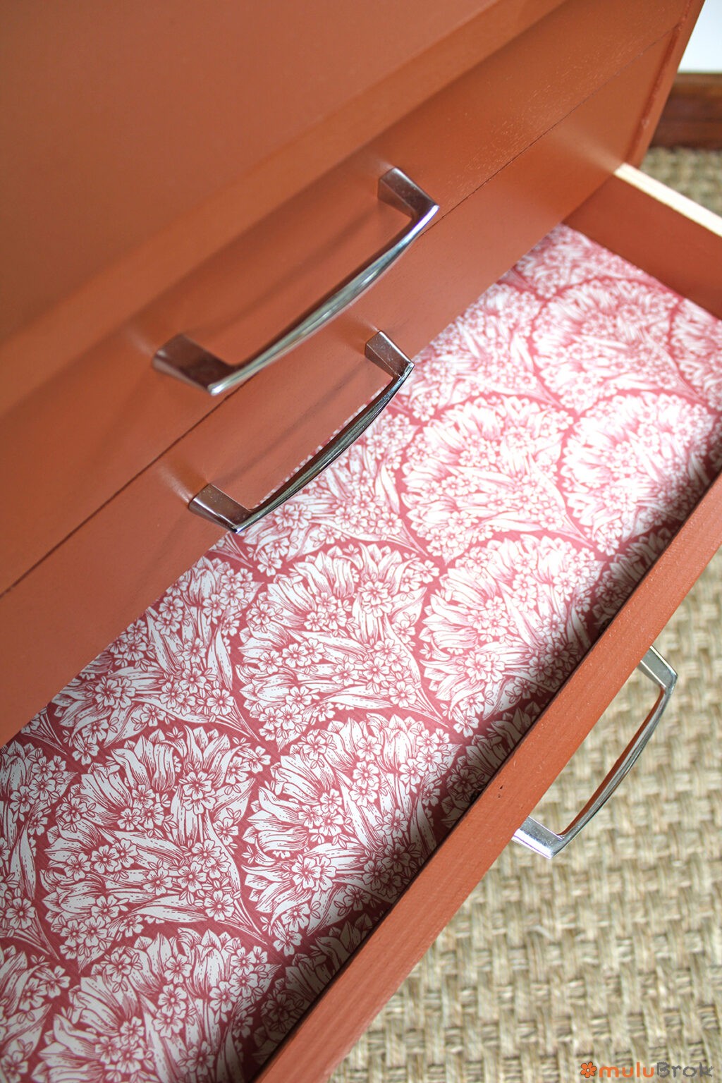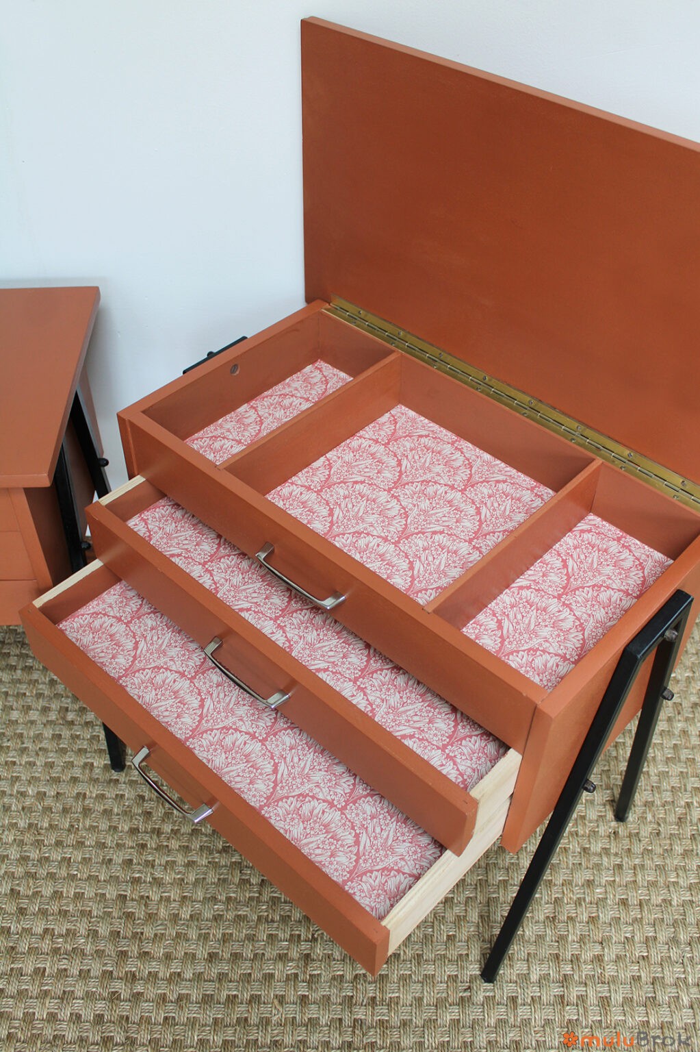 Le fond des tiroirs est tapissé d’un papier peint rose vintage.