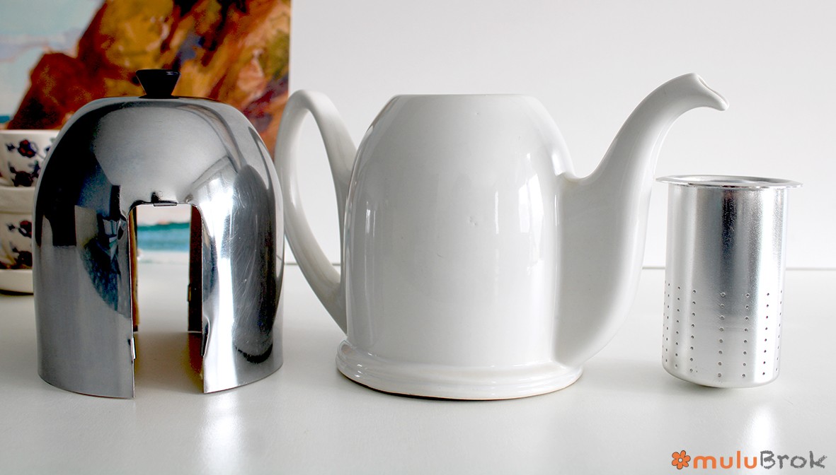 Cloche inox effet miroir, avec feutrine à l’intérieur pour maintenir le thé à bonne température.