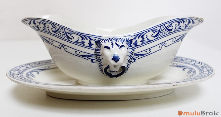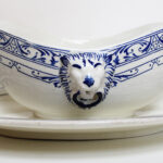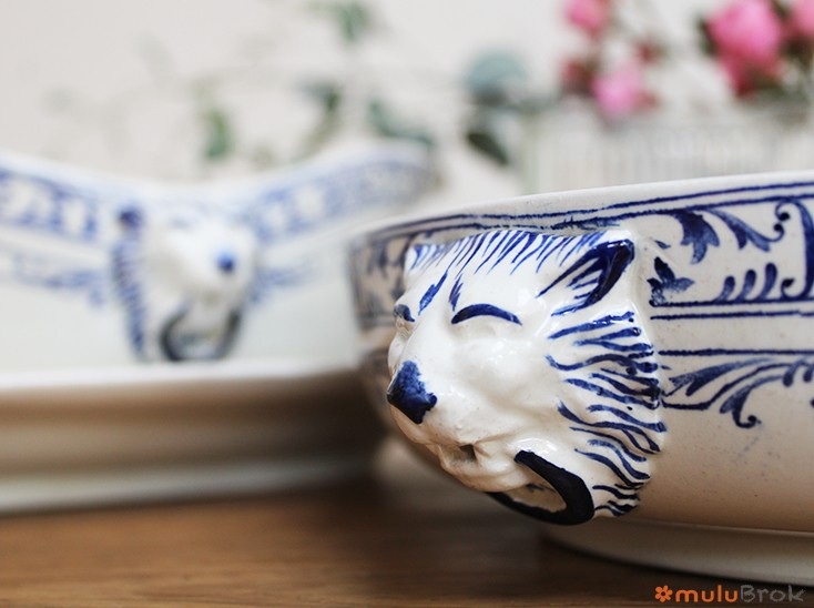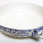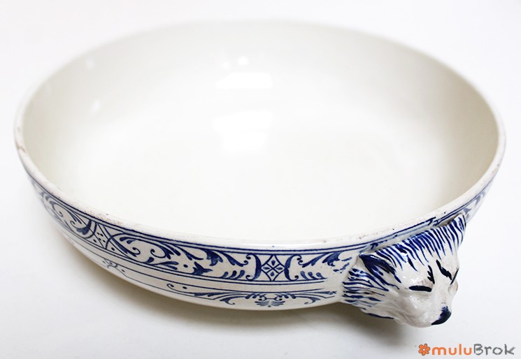 Faïence blanche, motif bleu, avec têtes de lion en relief.