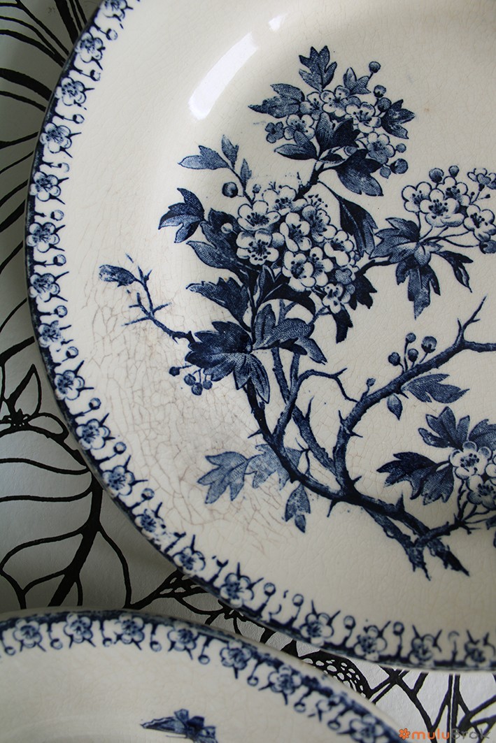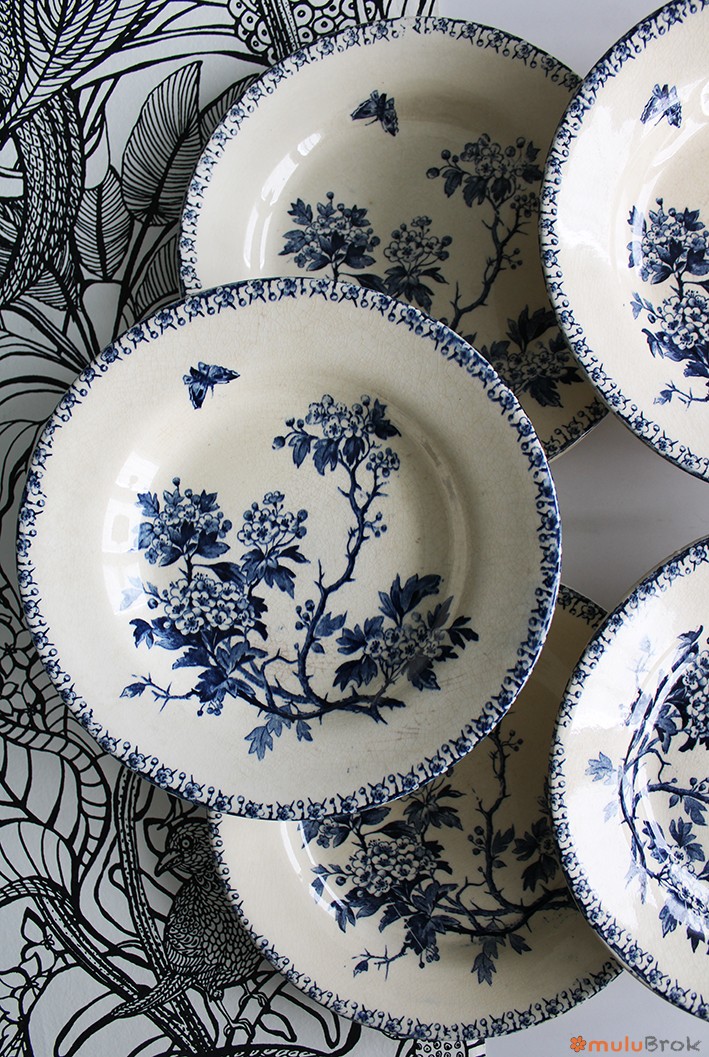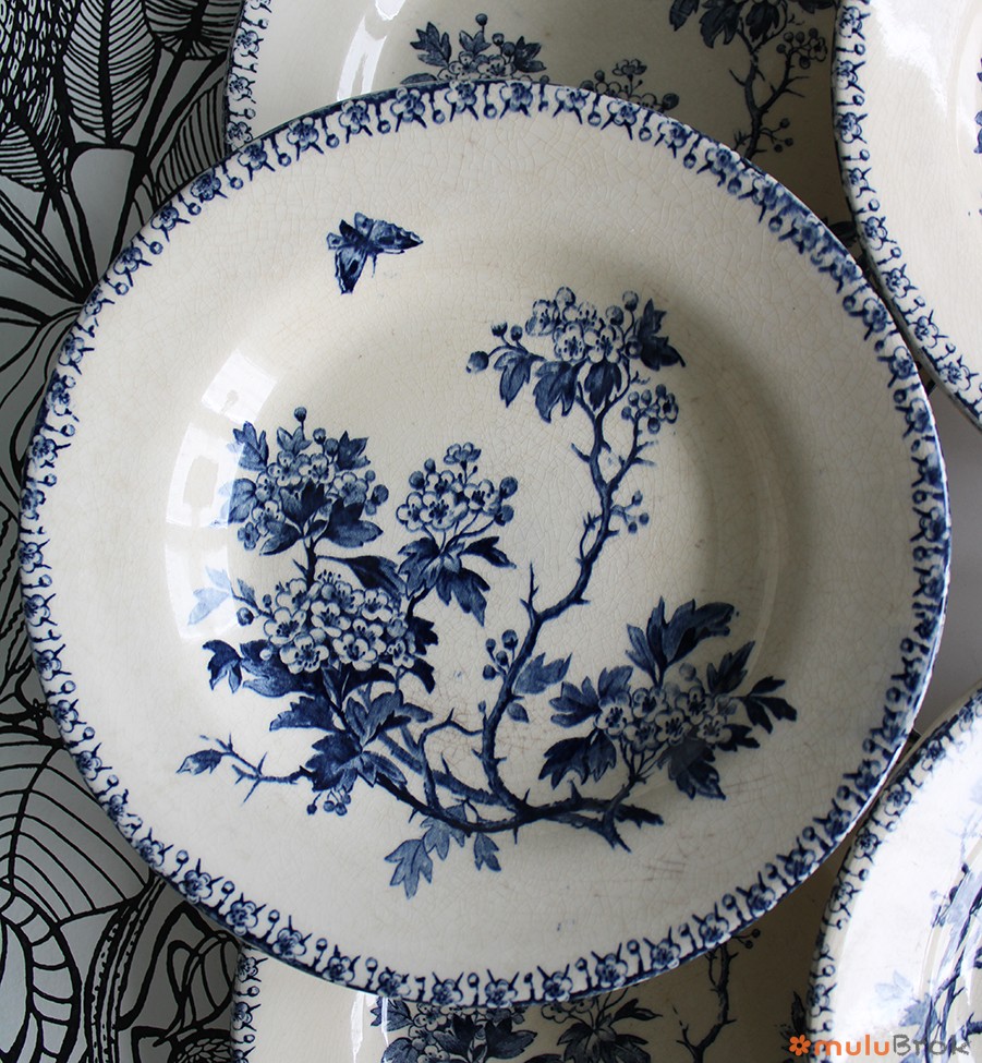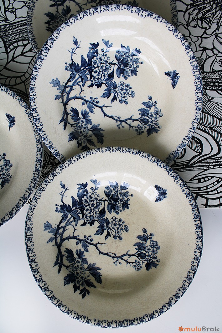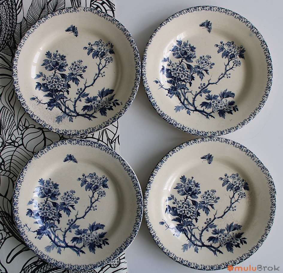 Motif : Bleu. Branches fleuris et papillons avec contour.