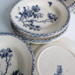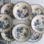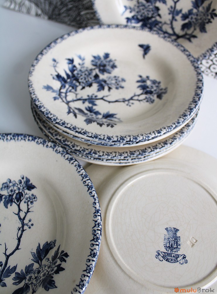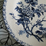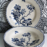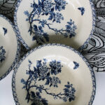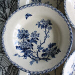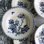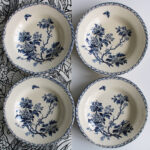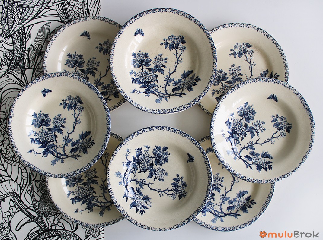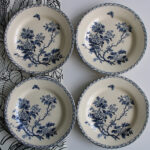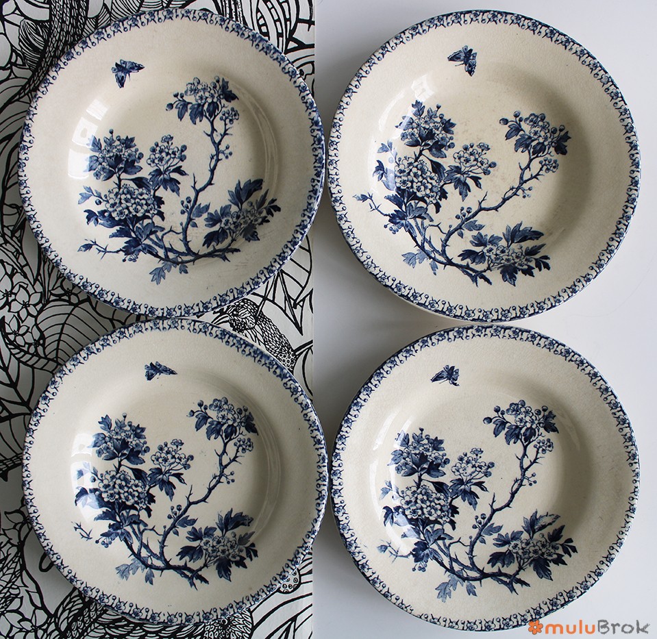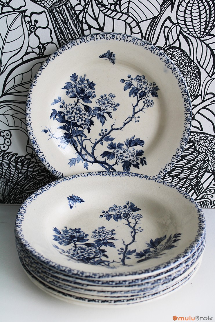 Motif : Bleu. Branches fleuris et papillons avec contour.