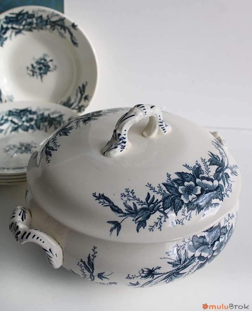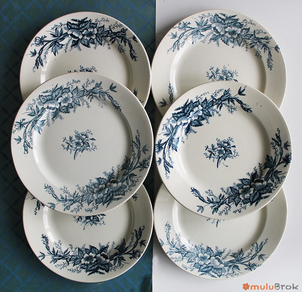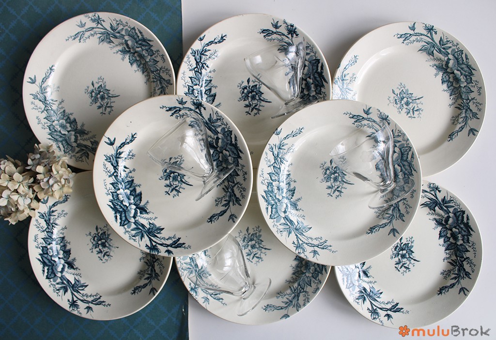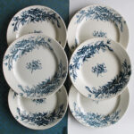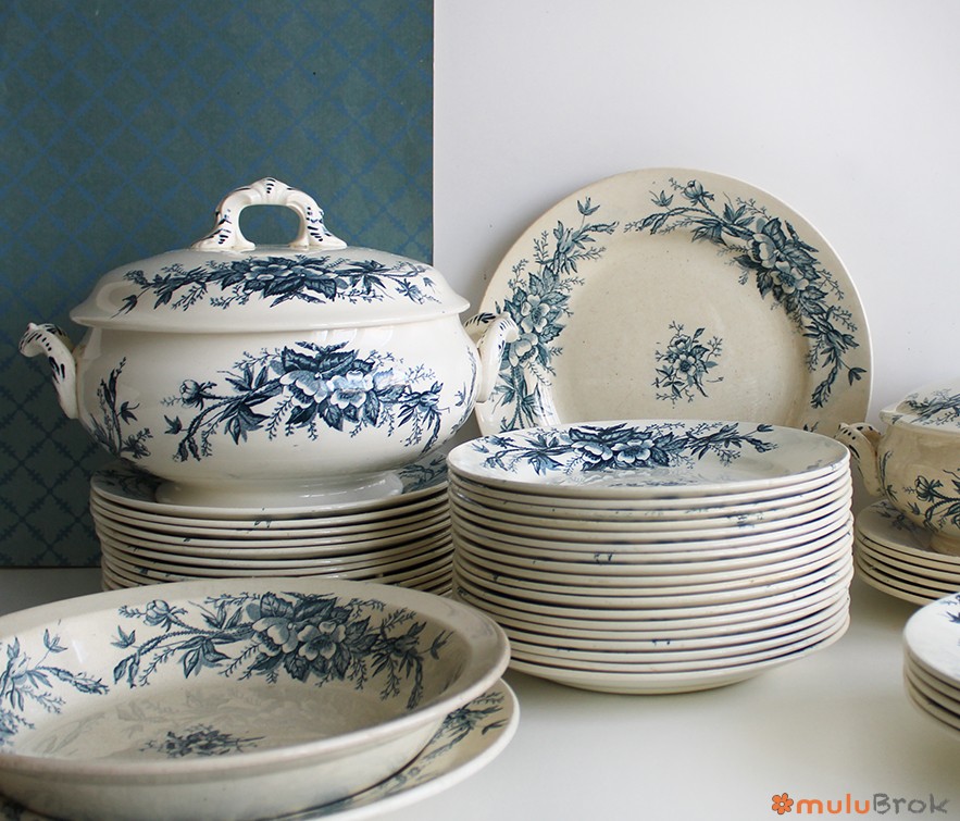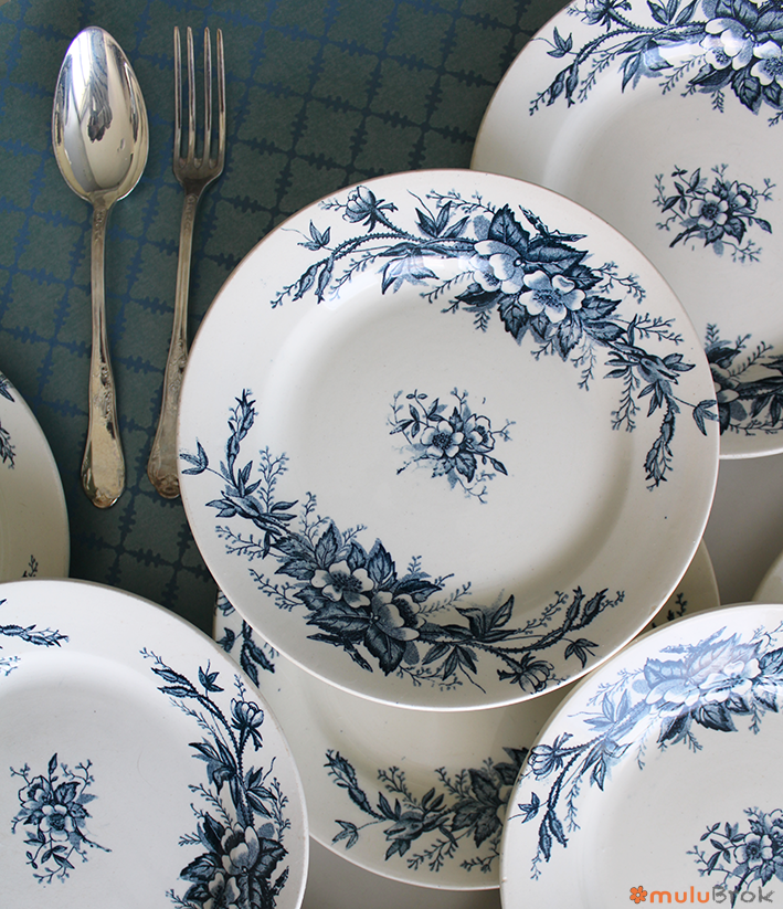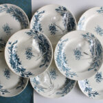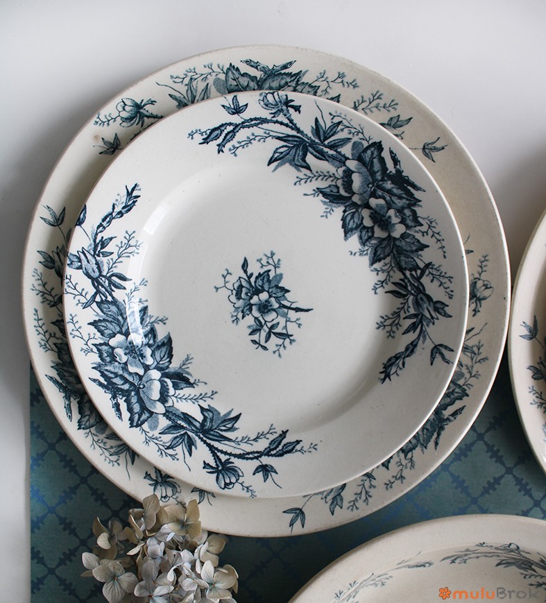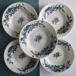 Motif : Fleurs et feuillages gris bleus sur le contour et au centre de chaque pièce.