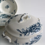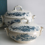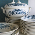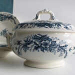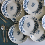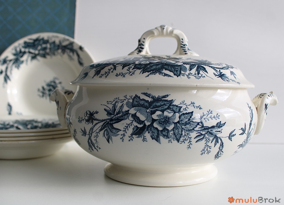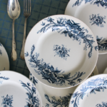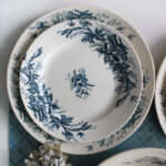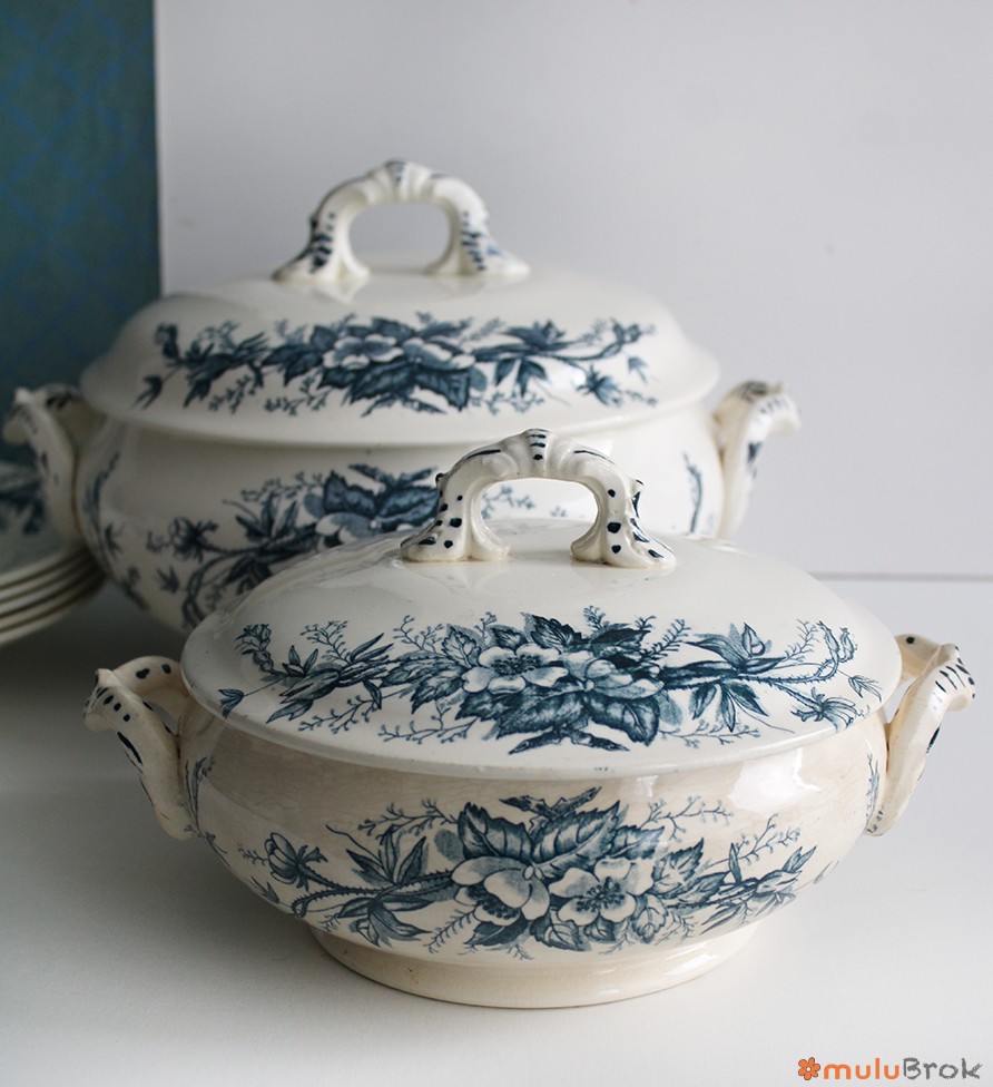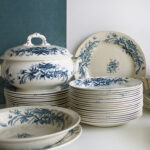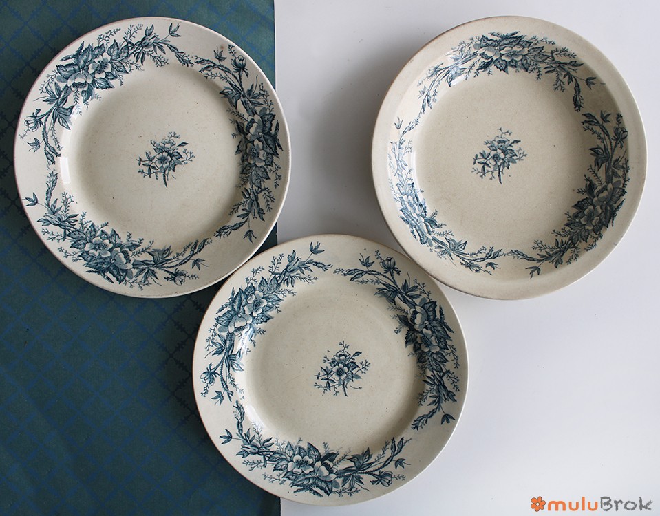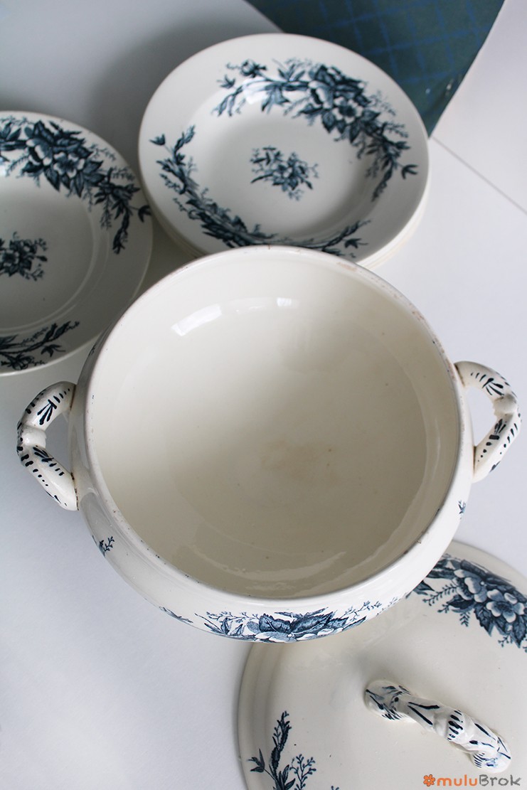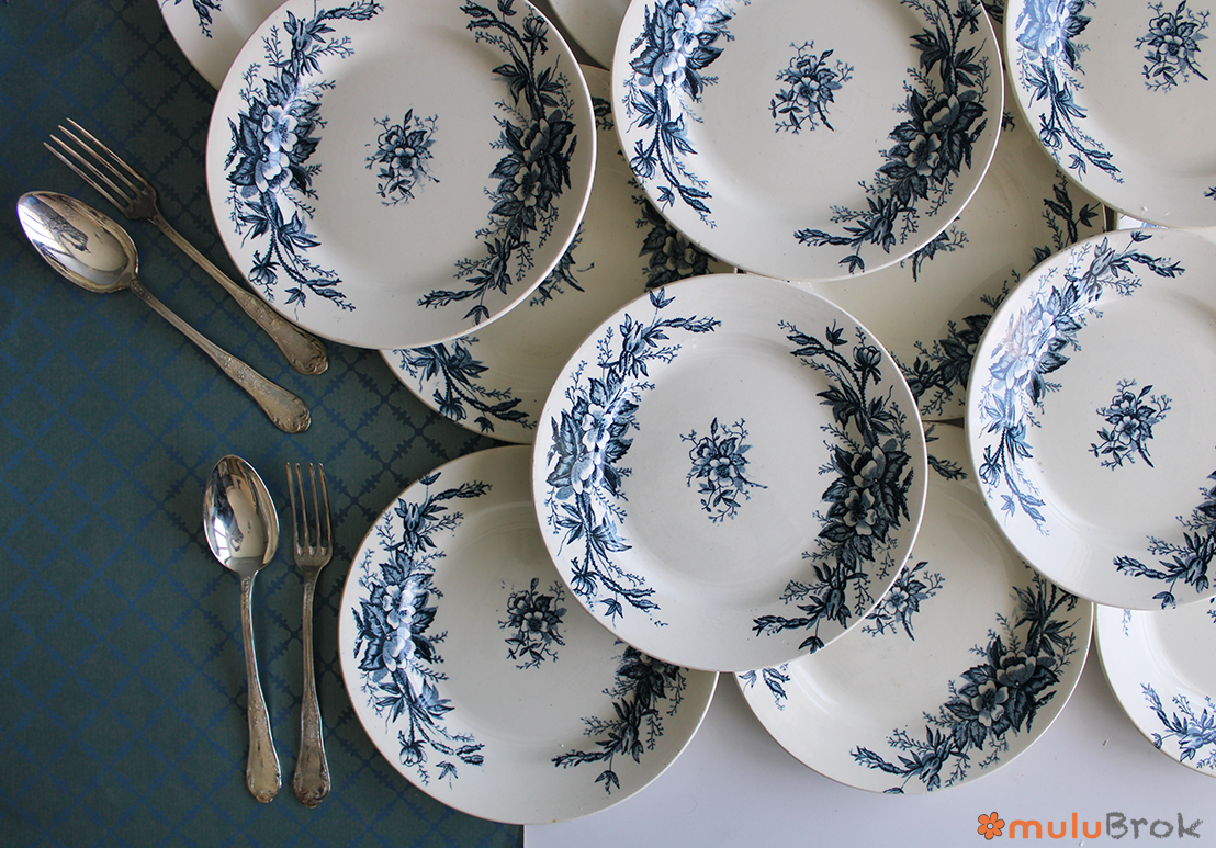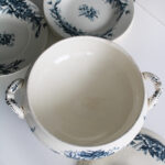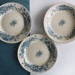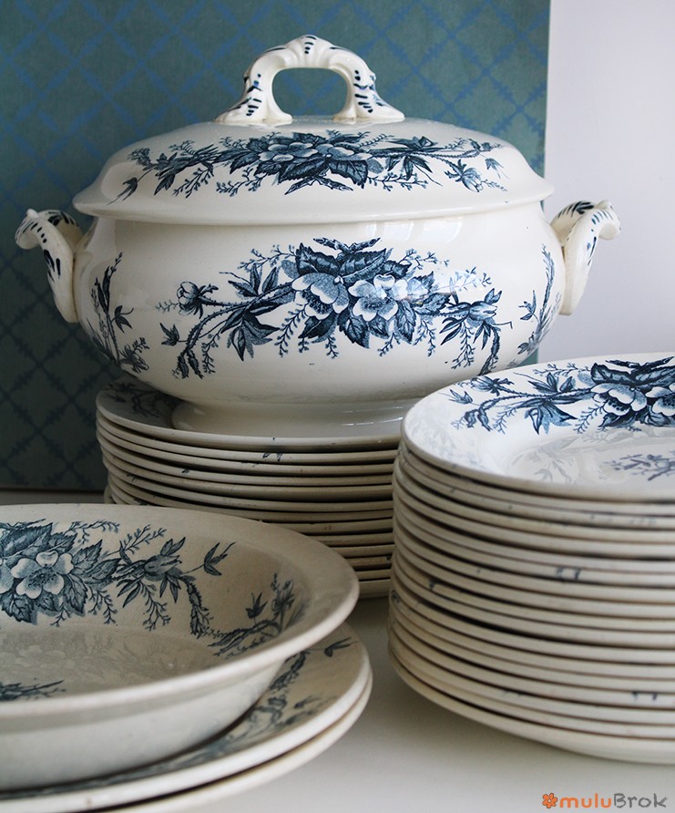 Motif : Fleurs et feuillages gris bleus sur le contour et au centre de chaque pièce.