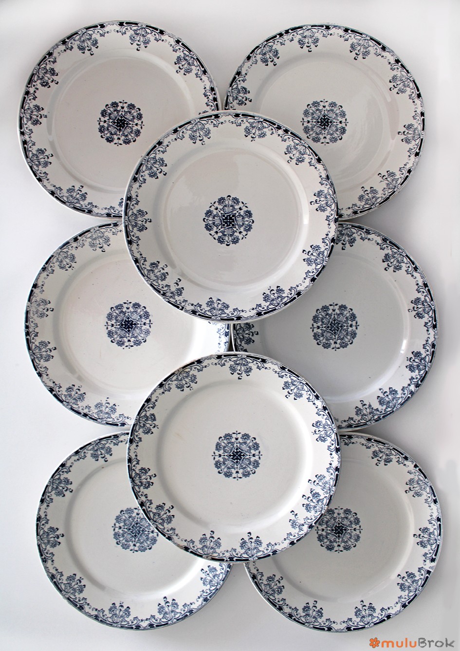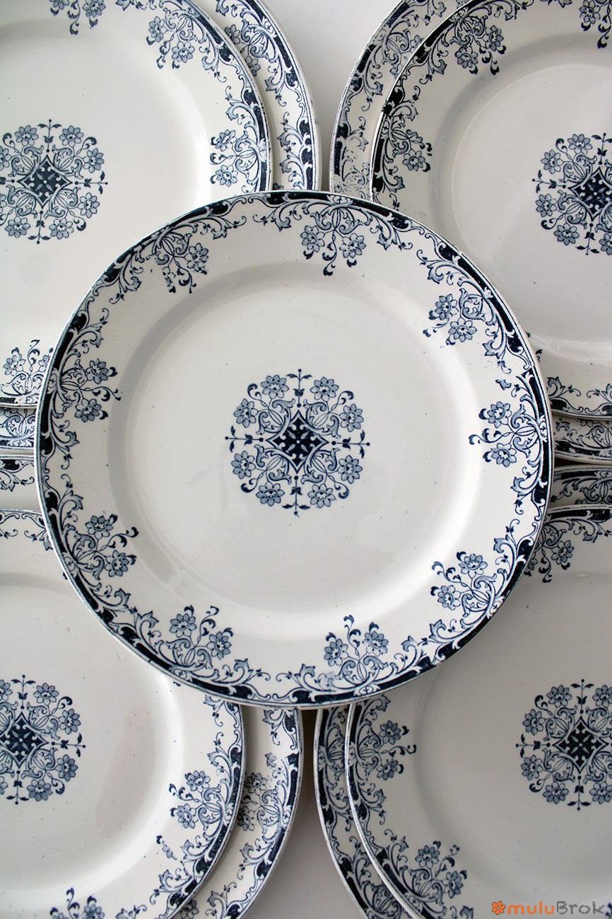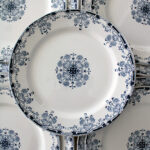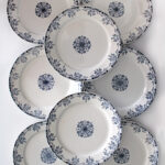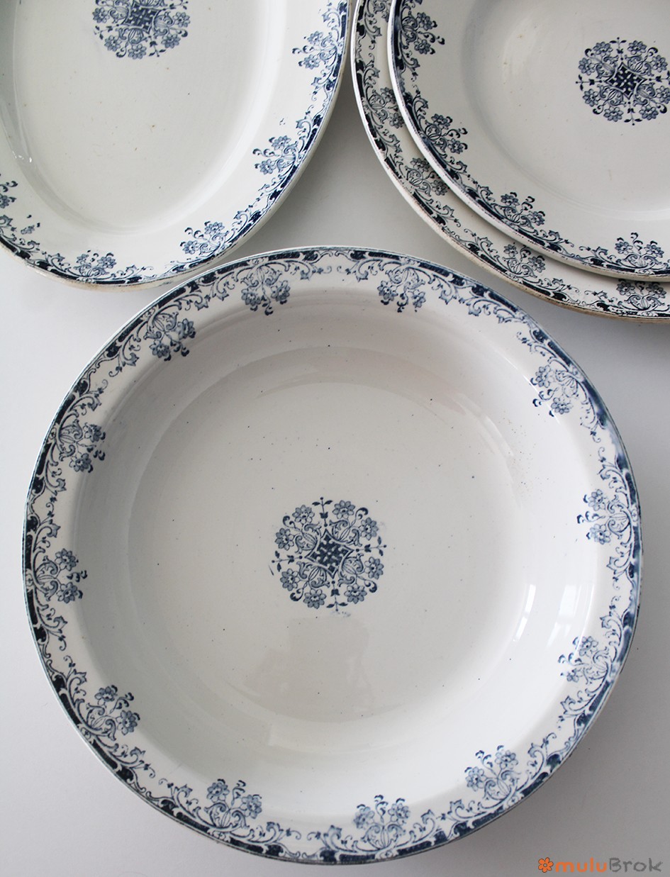 Motif : Fleurs bleues sur le contour et au centre de chaque pièce.