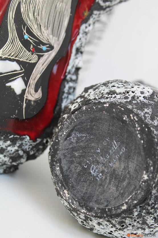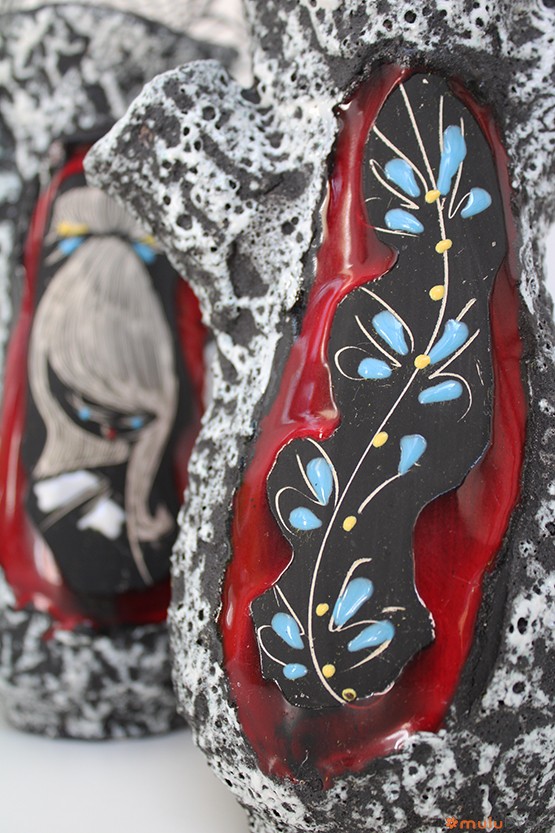 portrait jeune fille, coiffe avec touche émaillée jaune et bleu.