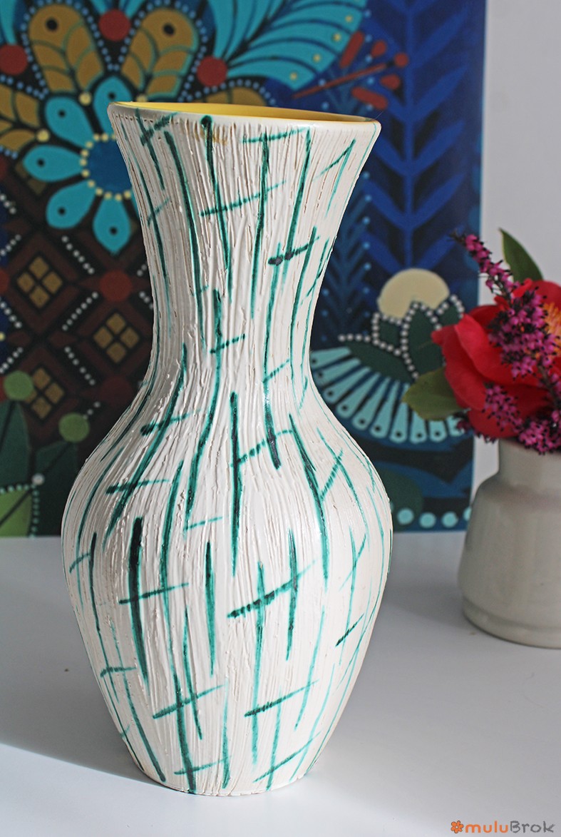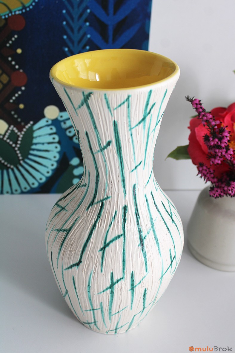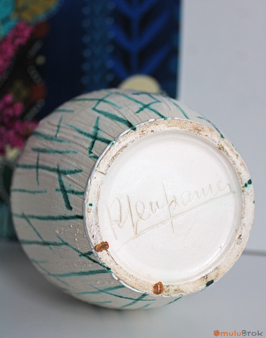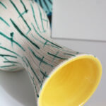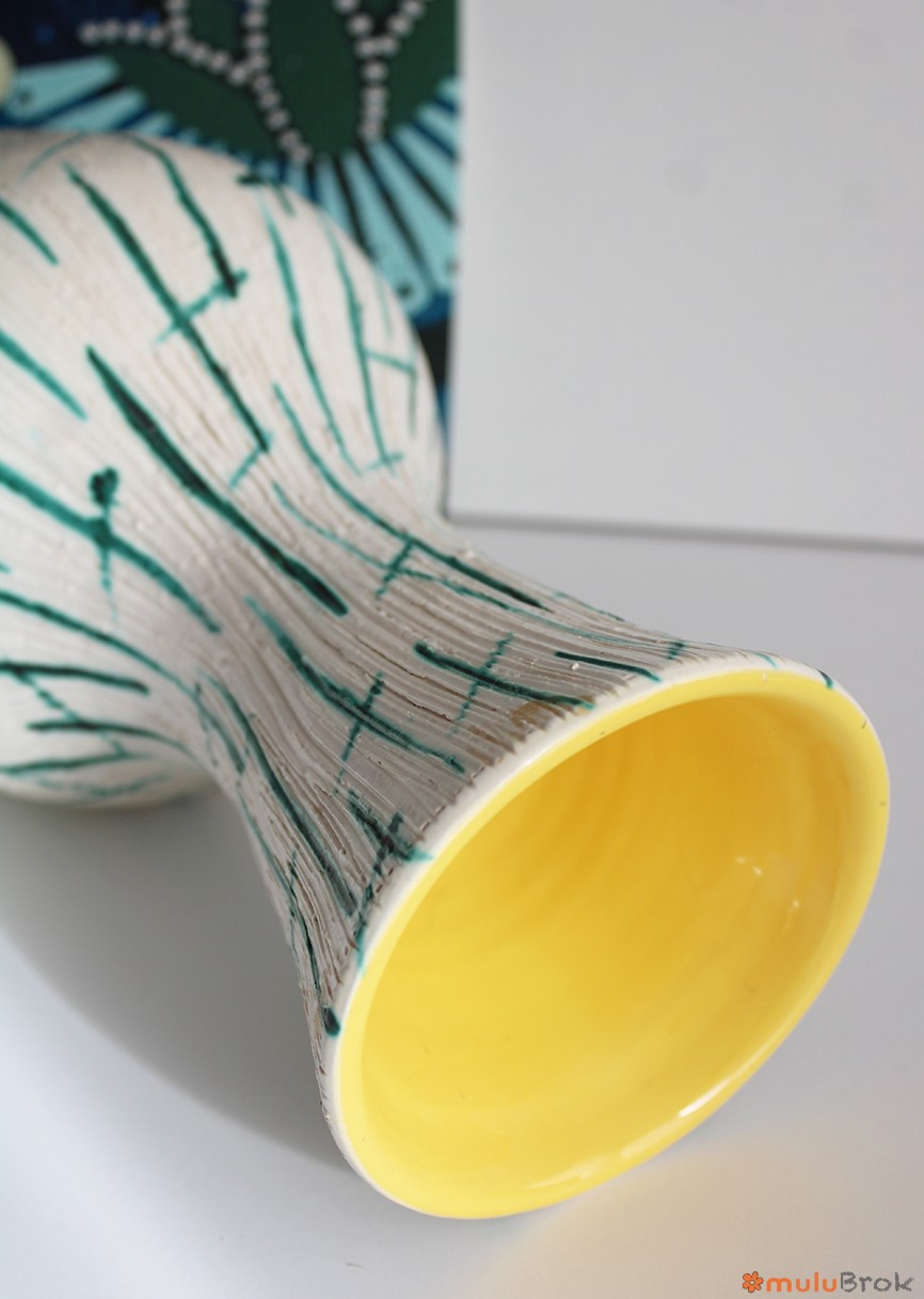 Coloris gris clair et lignes vertes. Intérieur jaune vernissé.