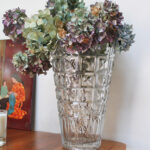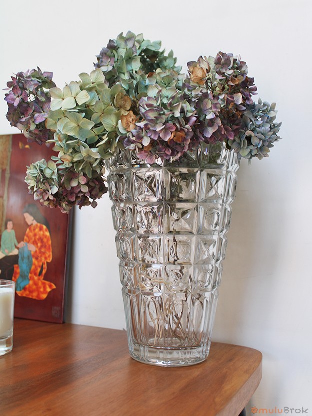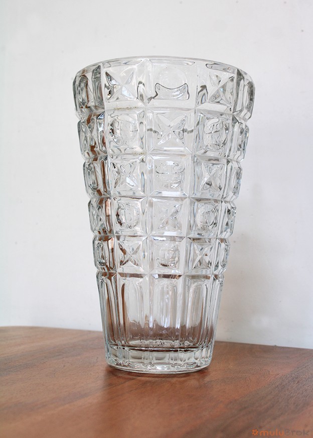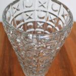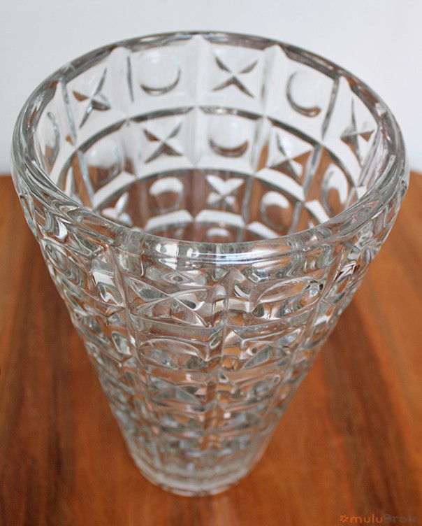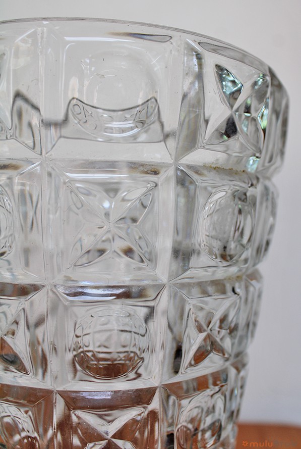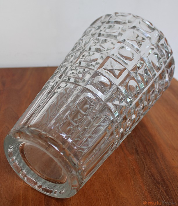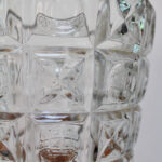 En verre pressé transparent, motif en relief : facettes cylindriques et en croix.