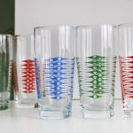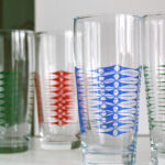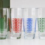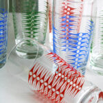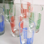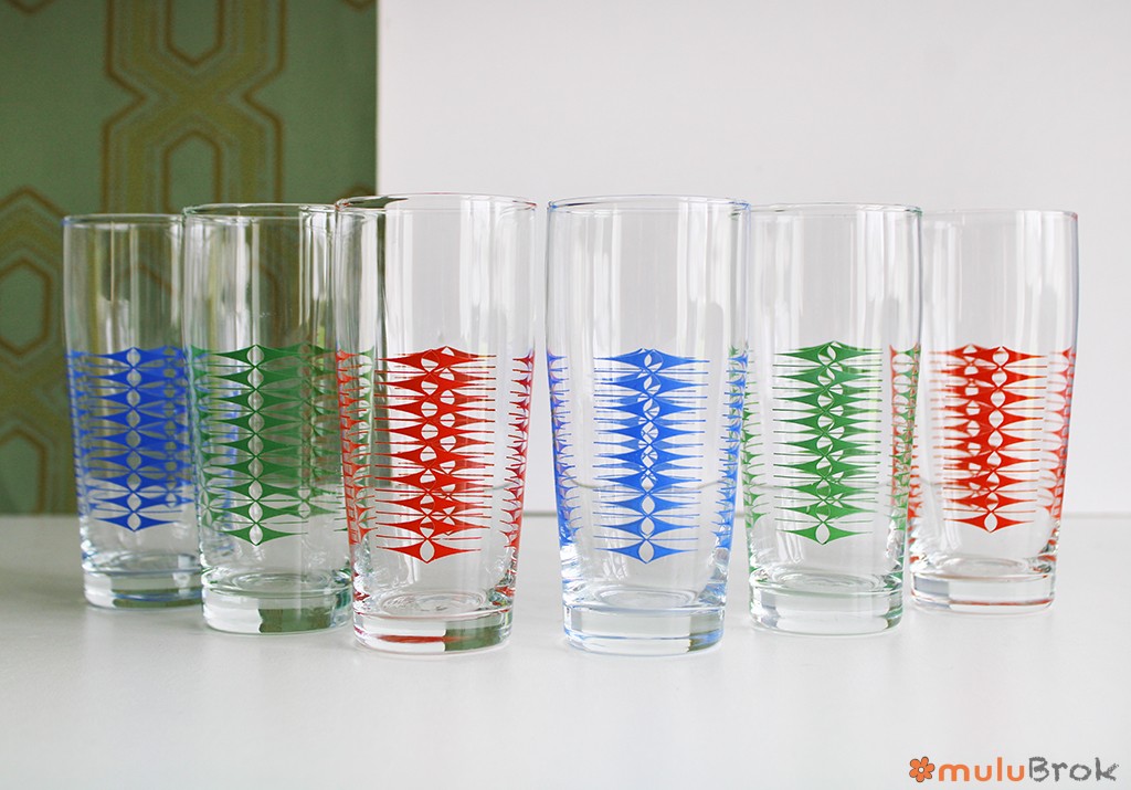 Verre décoré : motif géométrique vert, bleu ou rouge.