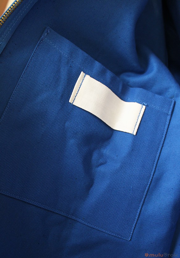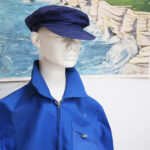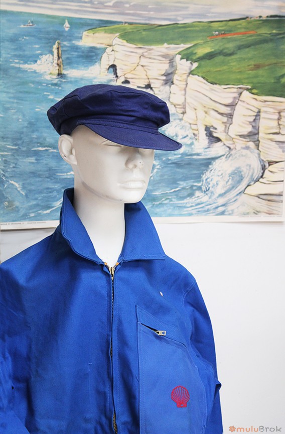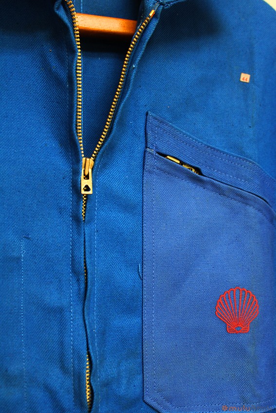 Coloris bleu avec l’ancien logo Shell, coquillage rouge brodé.
